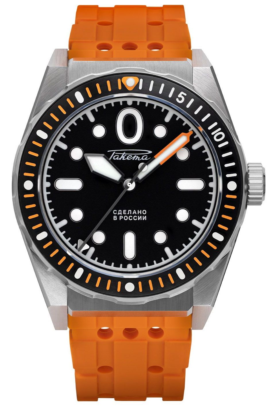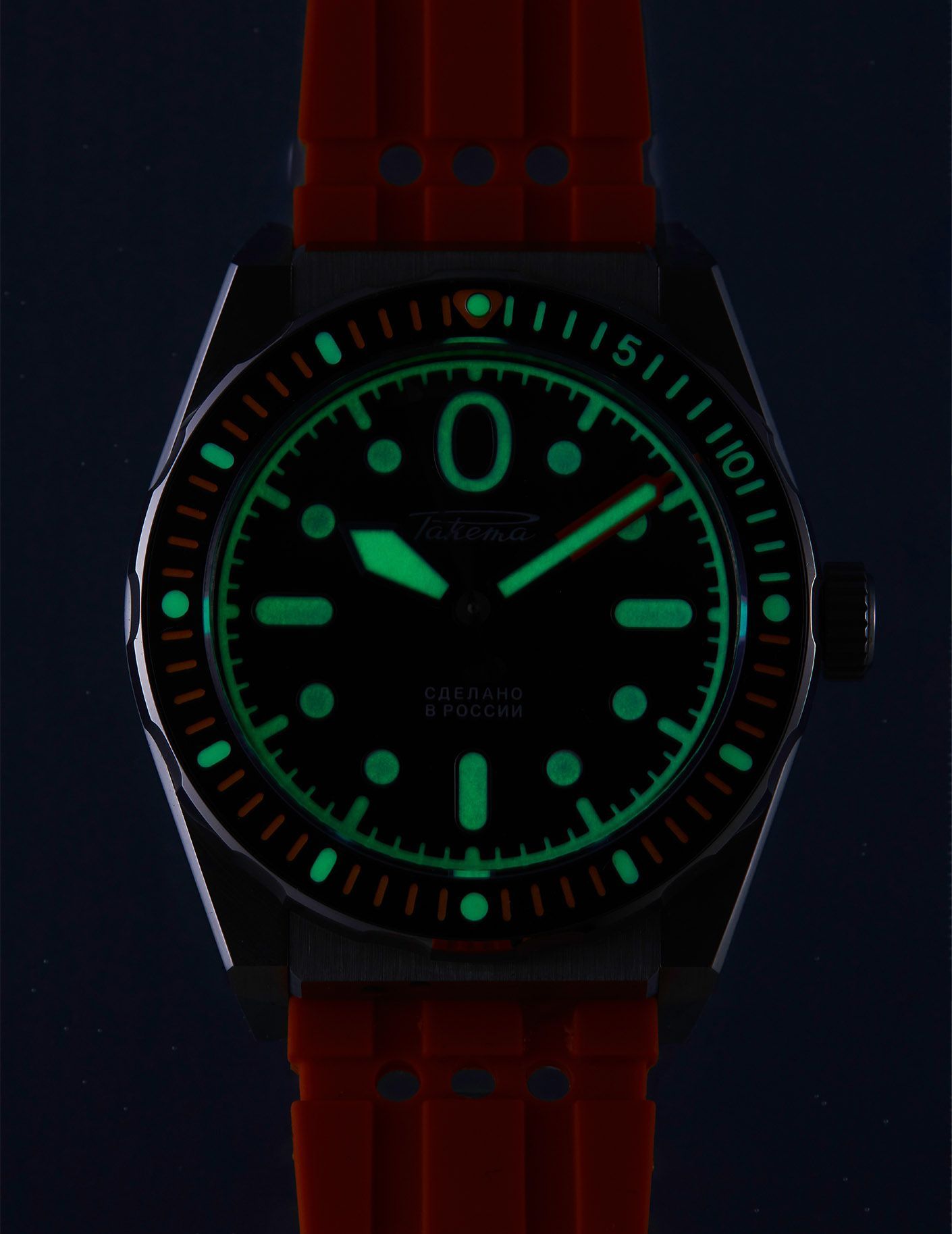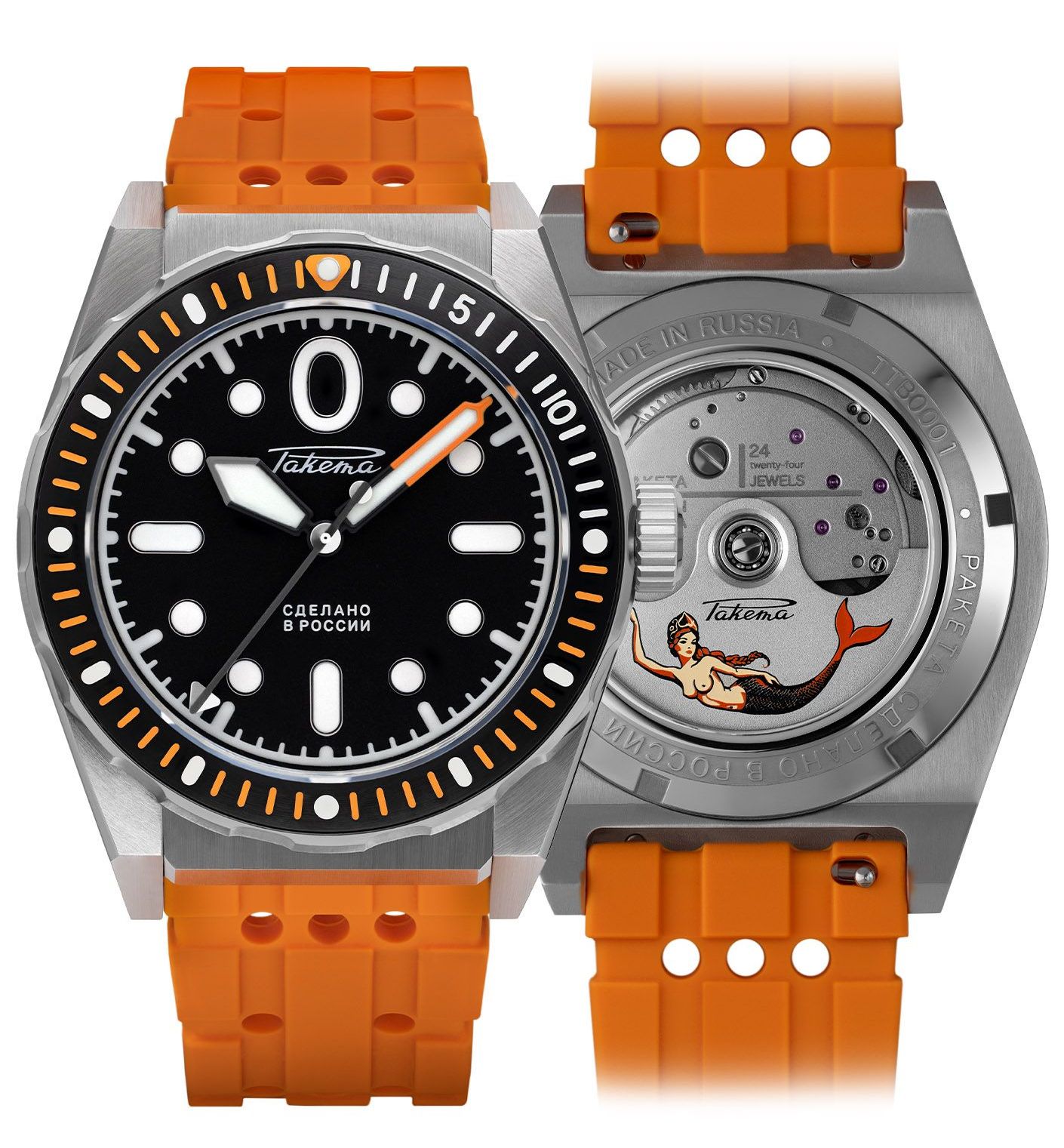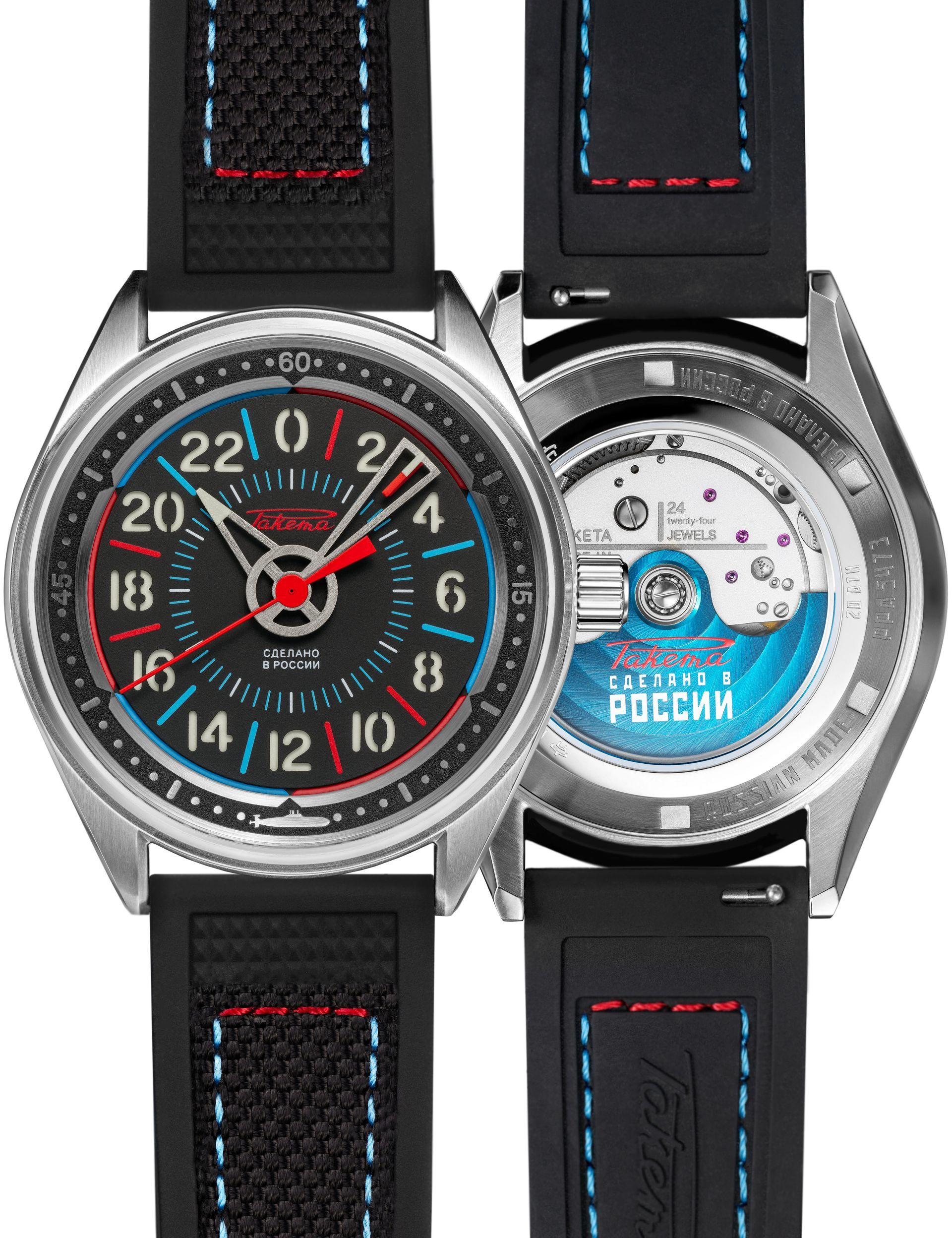 Its hands are powered by a Raketa 24-hour automatic movement (Raketa caliber 2624А) which allows submariners to distinguish day from night during their long underwater missions;
