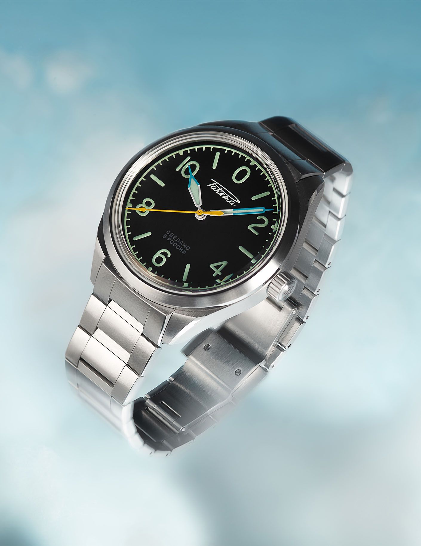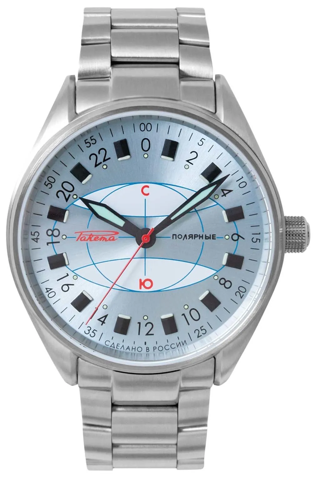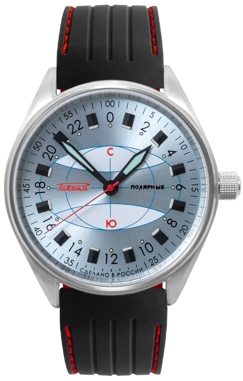The Raketa “Polar” is inspired by the brand’s legendary model, specially produced in 1970 for Soviet explorers on a mission in the Antarctic, who faced extreme living conditions. The dial divided into 24 hours allows you to know the exact time even beyond the polar circle, where it is impossible to distinguish day from night. The current model is even more efficient. The 44 mm steel case, water-resistant to 20 atm, has a screw-down crown and an ultra-resistant sapphire crystal that protects the dial. Thanks to the luminescent coating of the hands and numerals, you can read the time even in polar darkness.