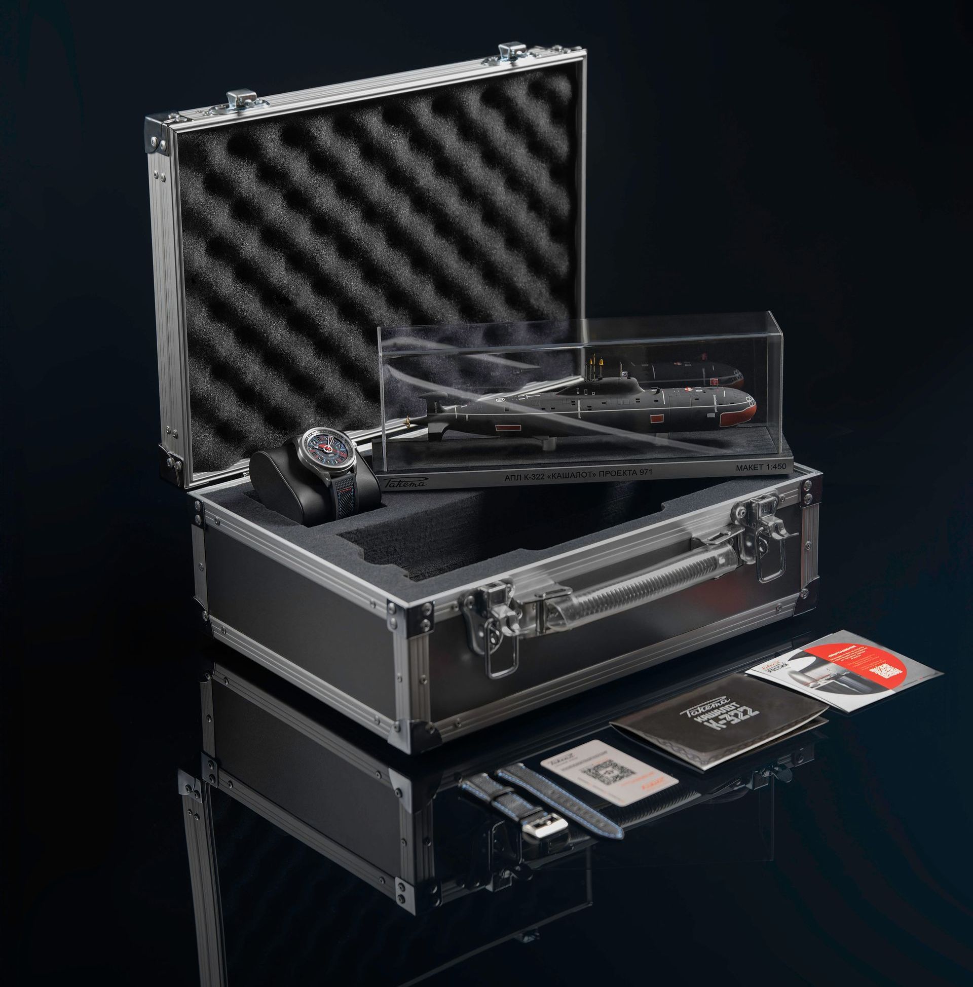 The Raketa "Sonar Kashalot" model is available only as part of a Collector's set. It includes: a certificate of origin of the metal used for the titanium bezel, an additional leather strap and a 1:450 scale model of the K-322 "Kashalot" submarine in a metal suitcase.