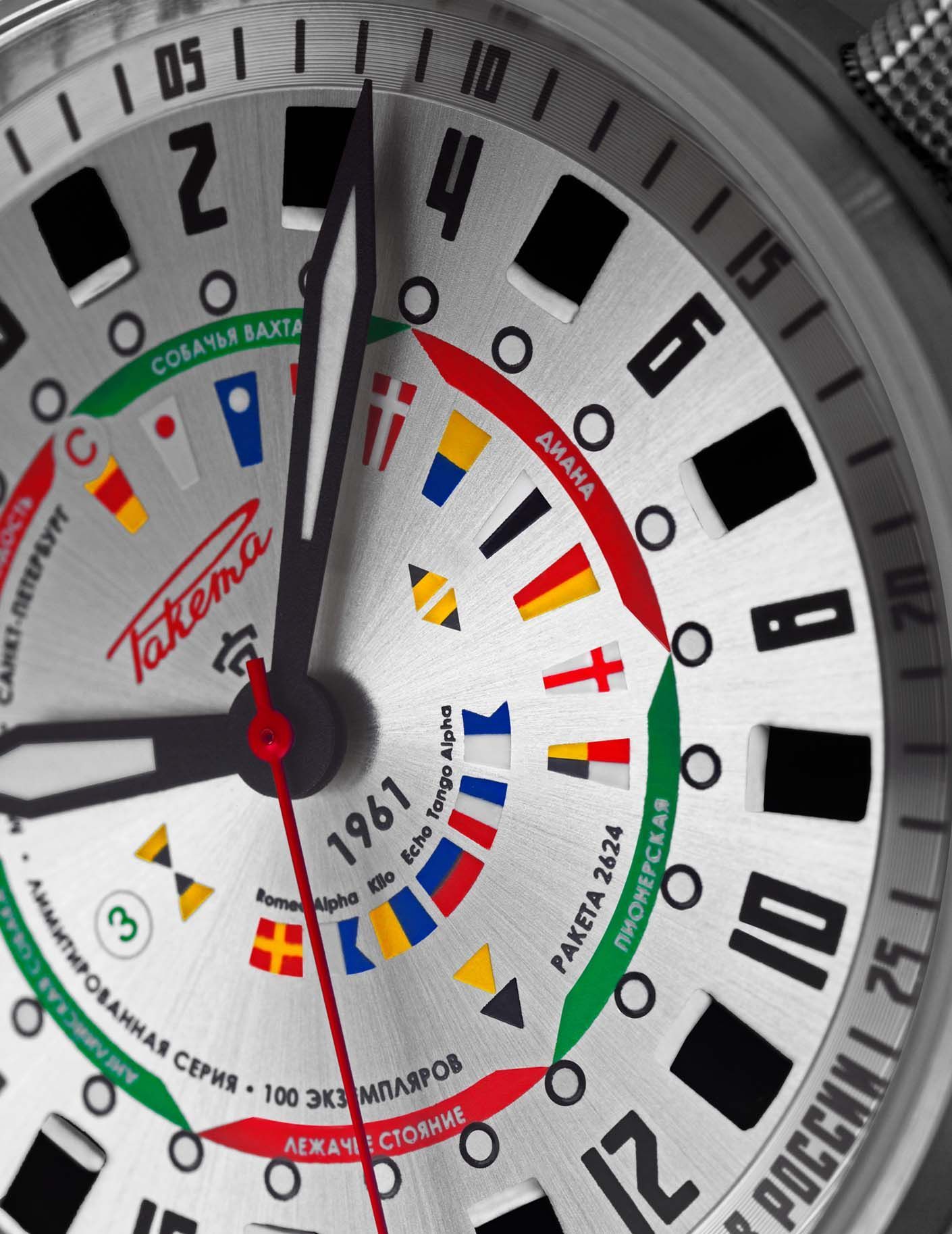 A limited series of automatic Russian watches dedicated to lovers of the sea. The dial of this "Seaman" watch features the maritime cardinal marks used to demarcate dangerous areas, as well as the names of watches with the corresponding time intervals, during which Russian sailors are on watch. The word "RAKETA" and the numbers "0" to "9" are written using the flags of the "maritime alphabet" which is used in the navy to transmit messages between ships. The 24-hour dial allows the watch to be used as a sun compass (by aligning the hour hand towards the sun) which is useful in case the ship's electronic compass no longer works. The 44mm watch case is water-resistant to 200 meters, which makes it perfectly suitable for use by "sailors". The caliber is decorated with painted marine motifs.