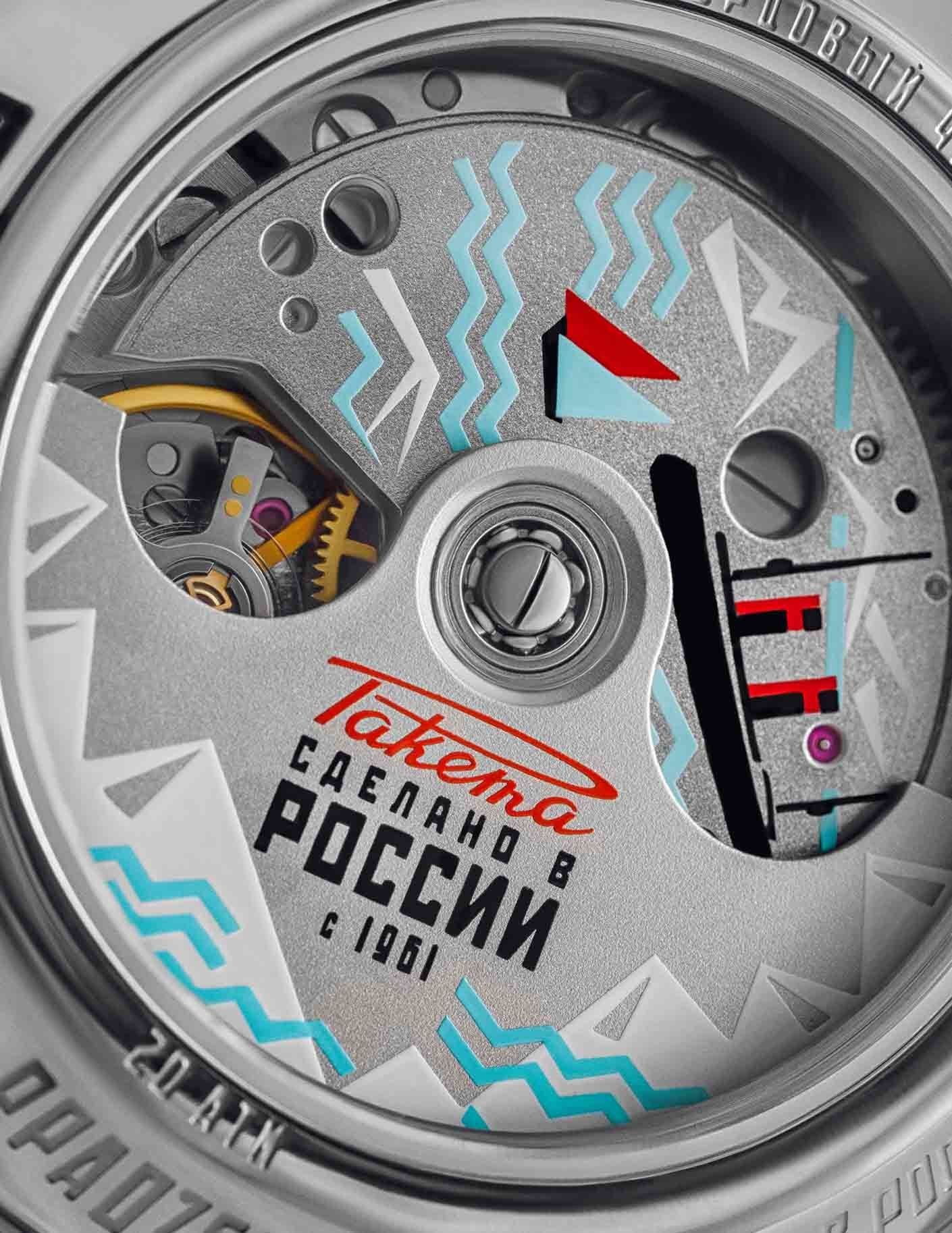 The transparent case back reveals the carefully decorated 24-hour automatic movement, entirely manufactured at the Raketa Watch Factory in St. Petersburg. The rotor finish is reminiscent of the Northern Lights.