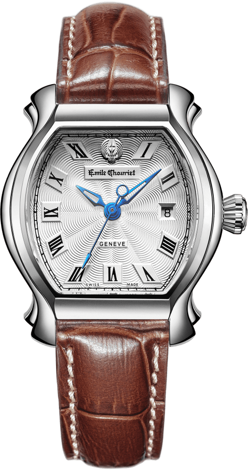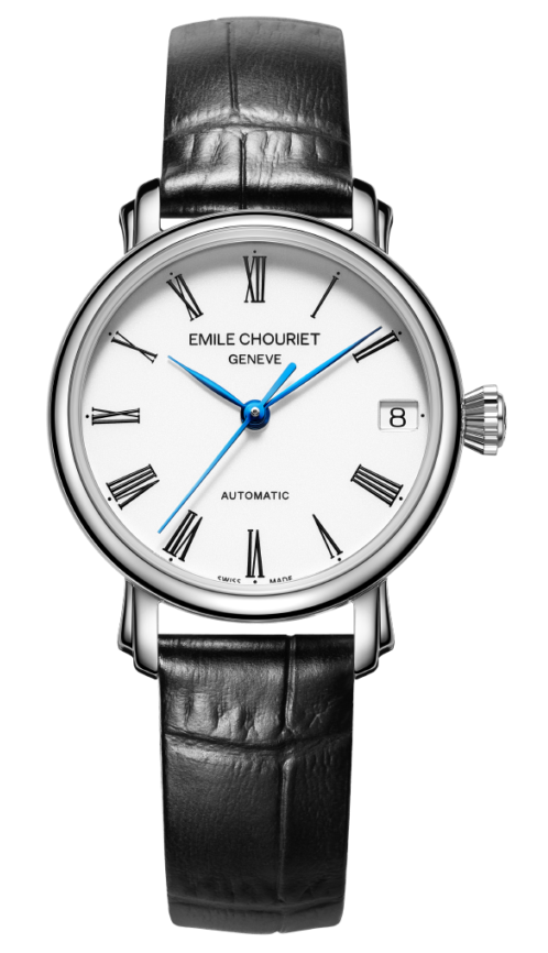 Mouvement automatique maison. Boîtier en acier de 29,2 mm, verre saphir, fond transparent, Cadran argenté frappé chiffre romain et index. Bracelet cuir, boucle ardillon.
