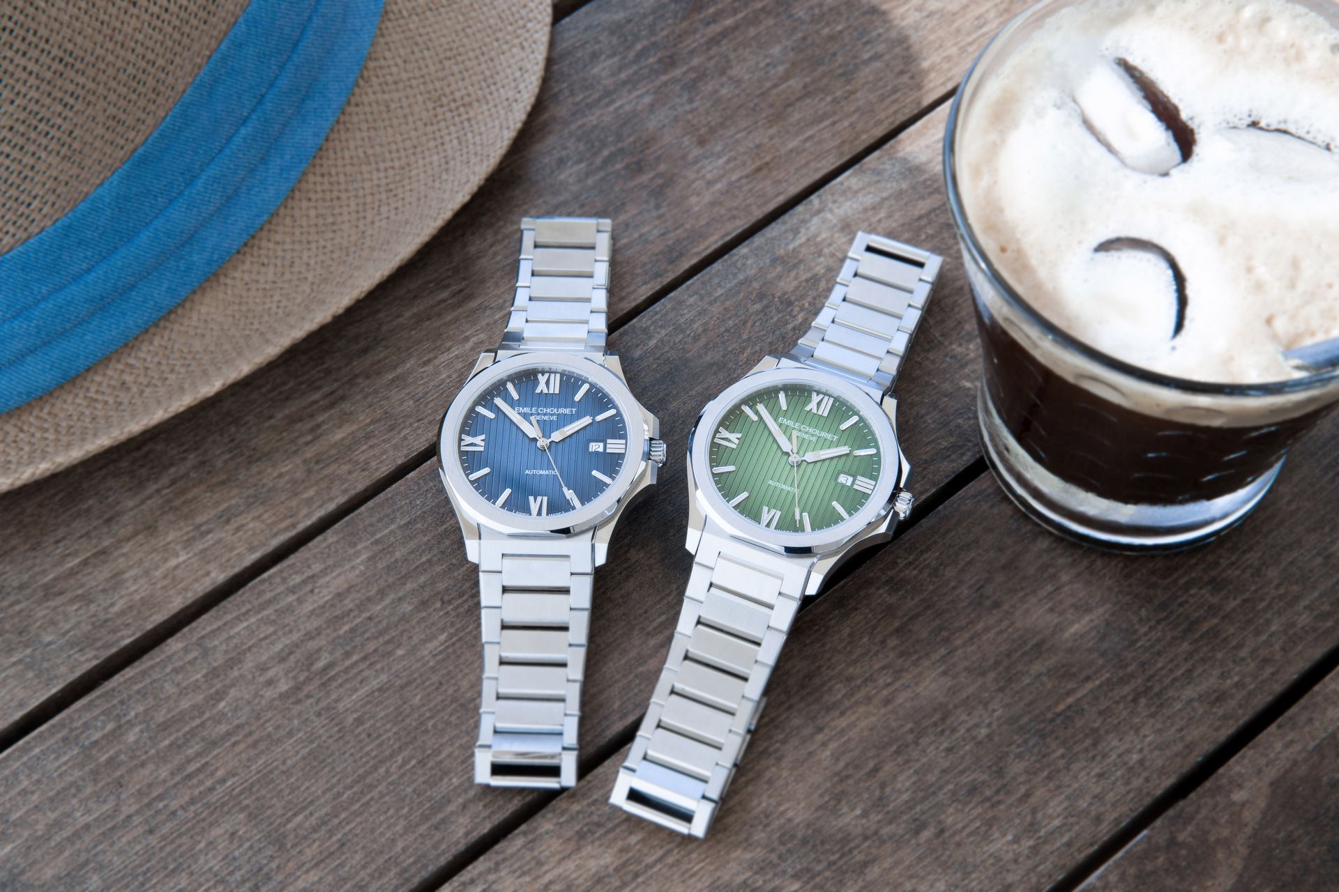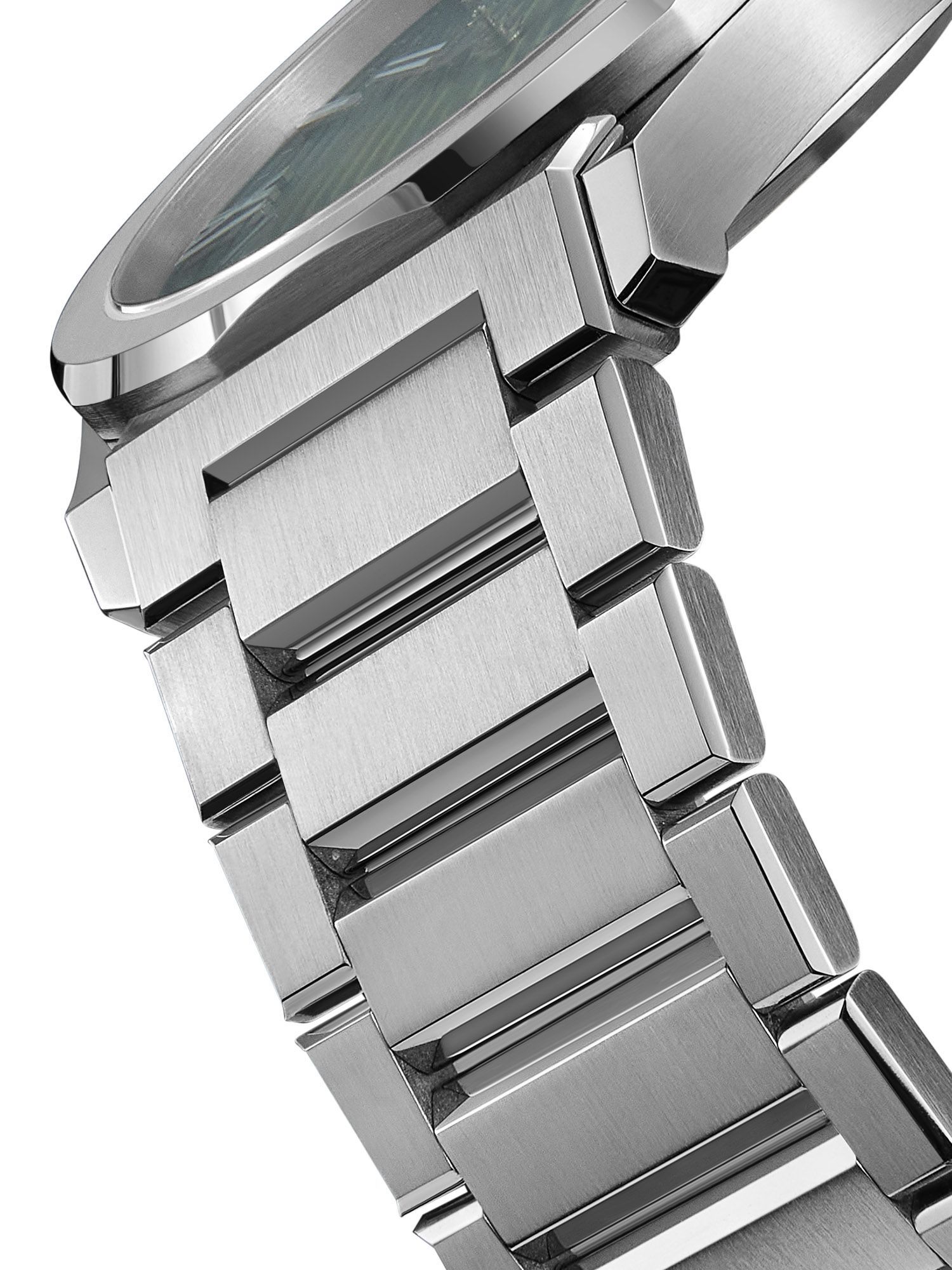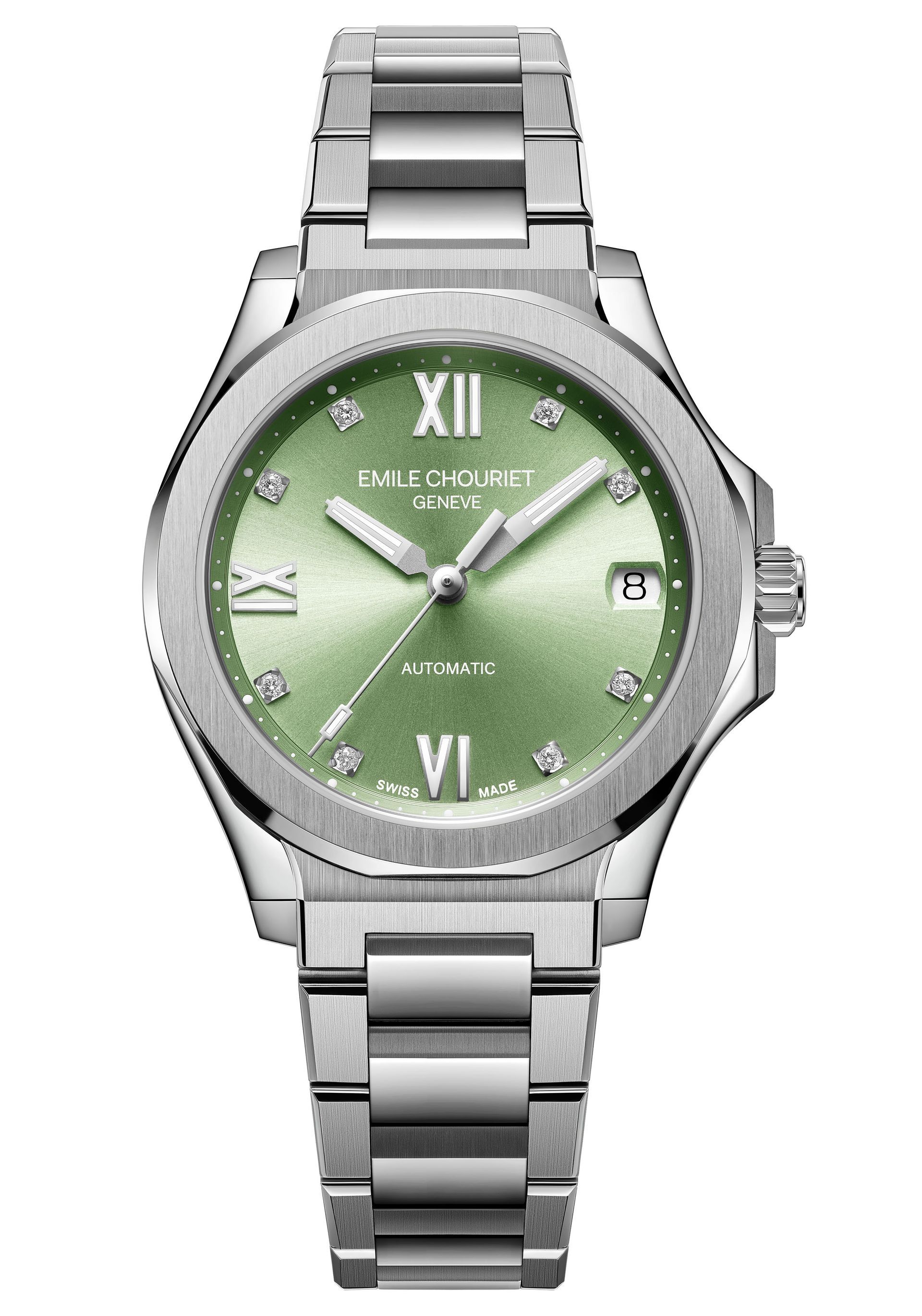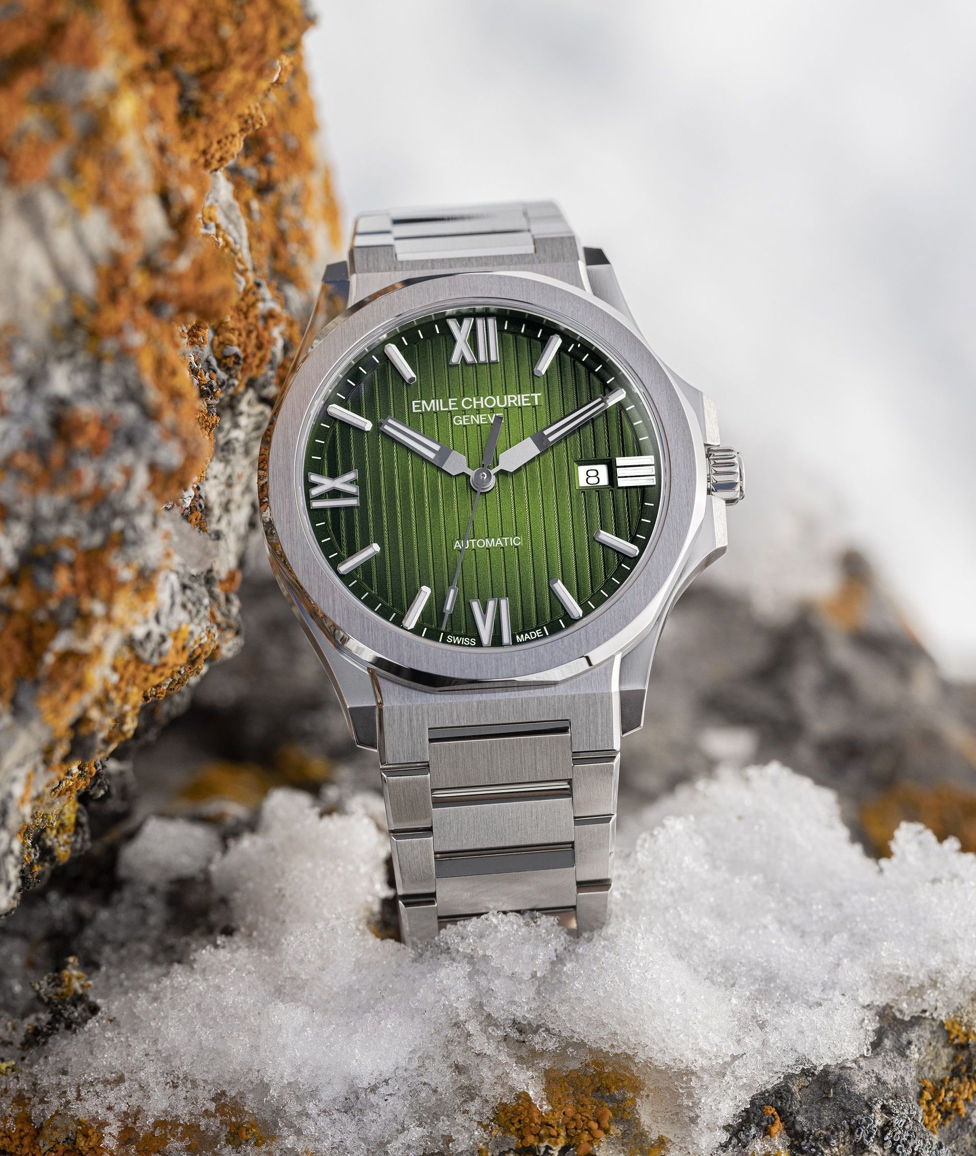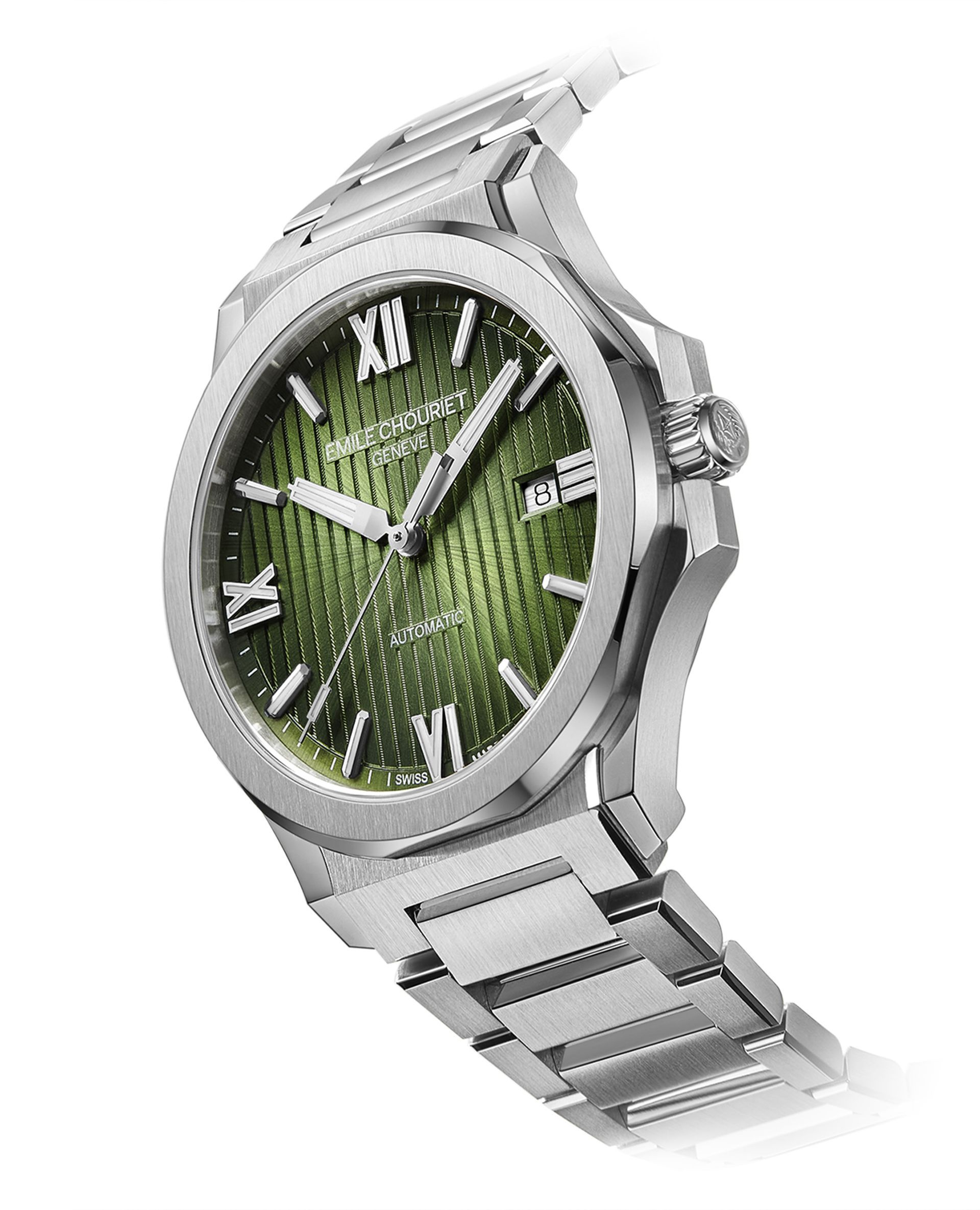 Mouvement automatique. Boîtier en acier de 41mm, verre saphir, étanche à 5 atm. Cadran vert rayé verticalement.