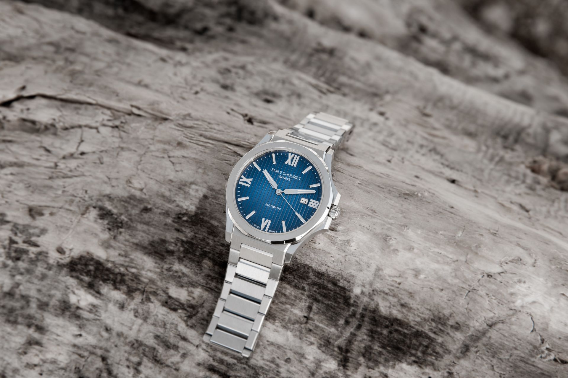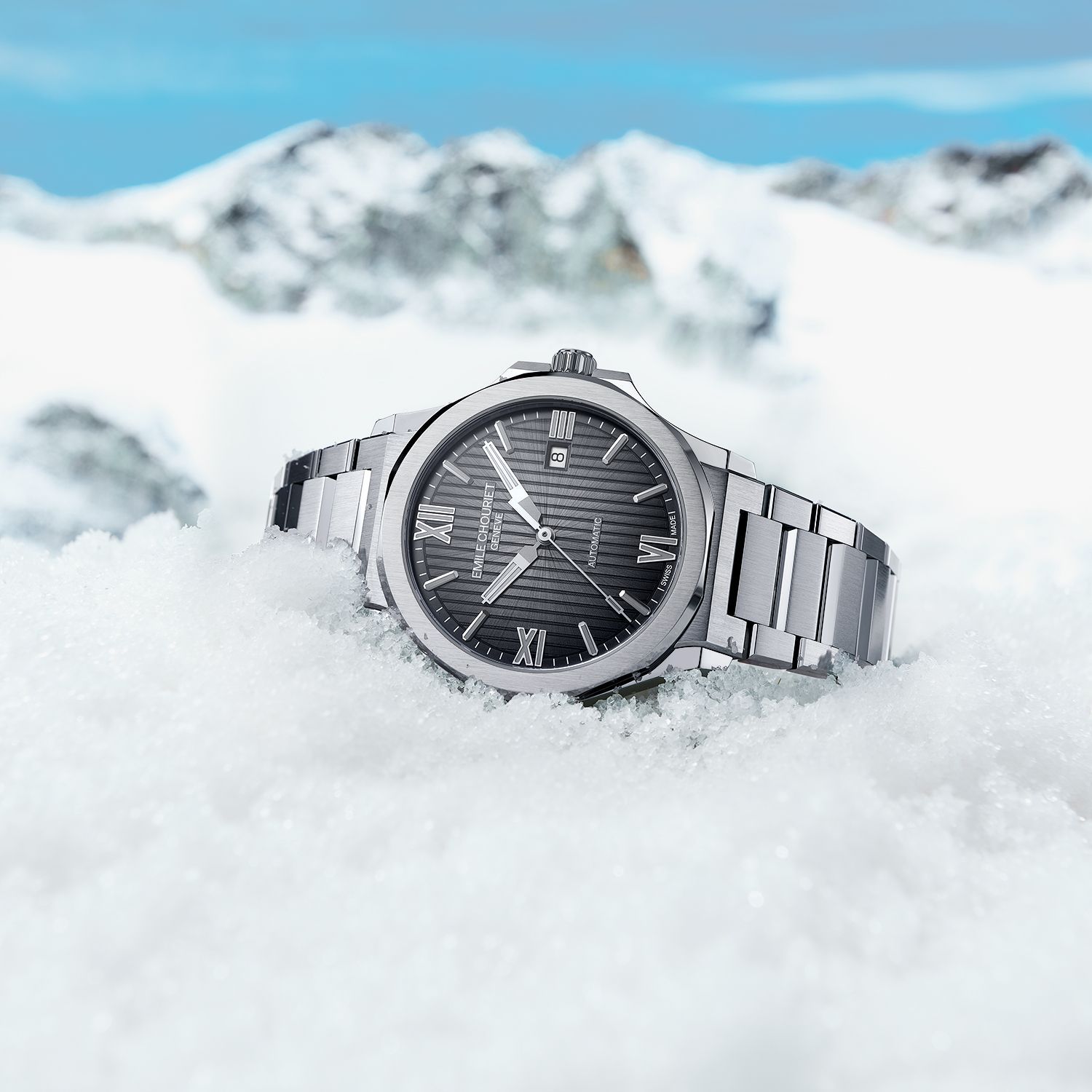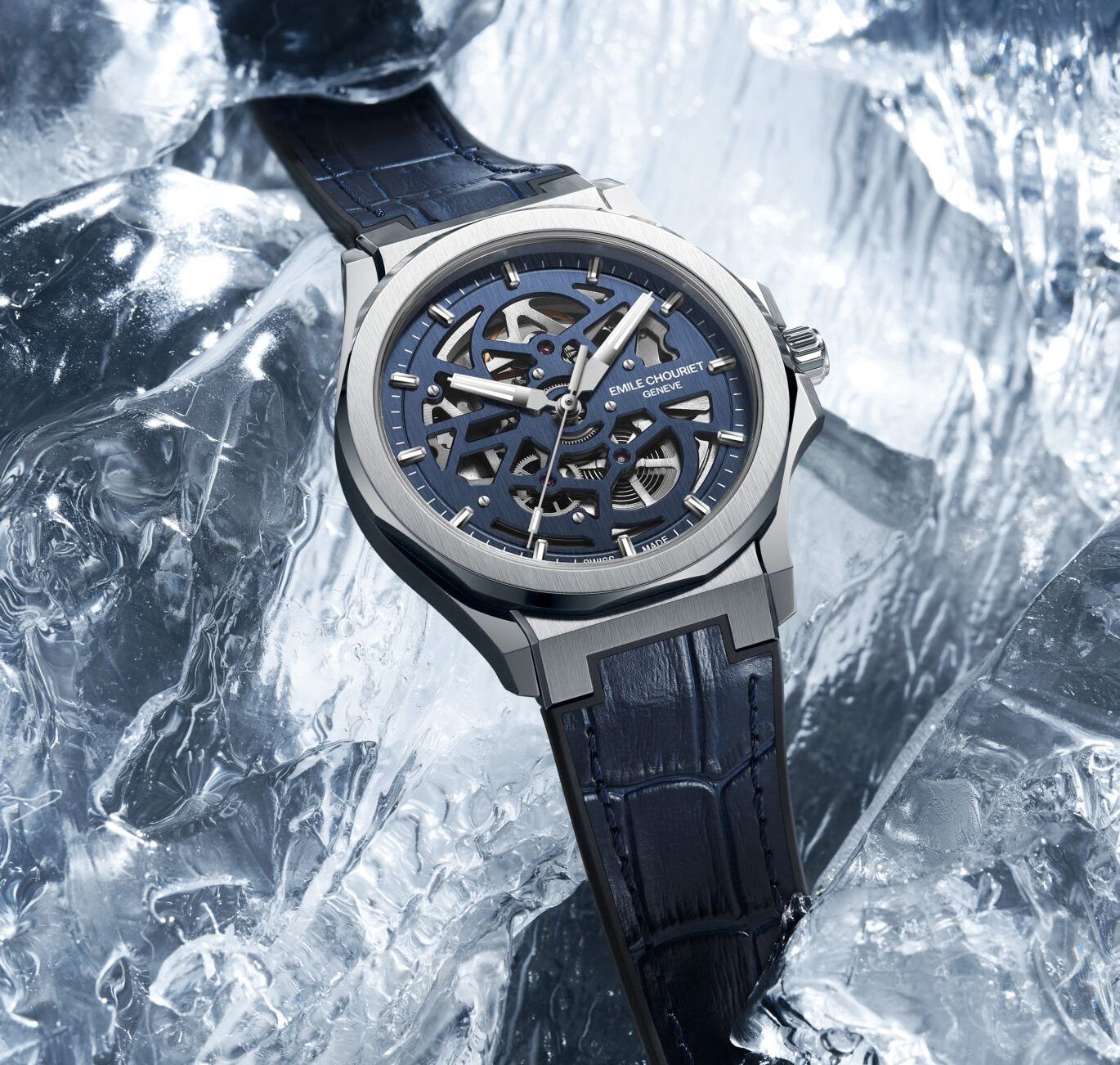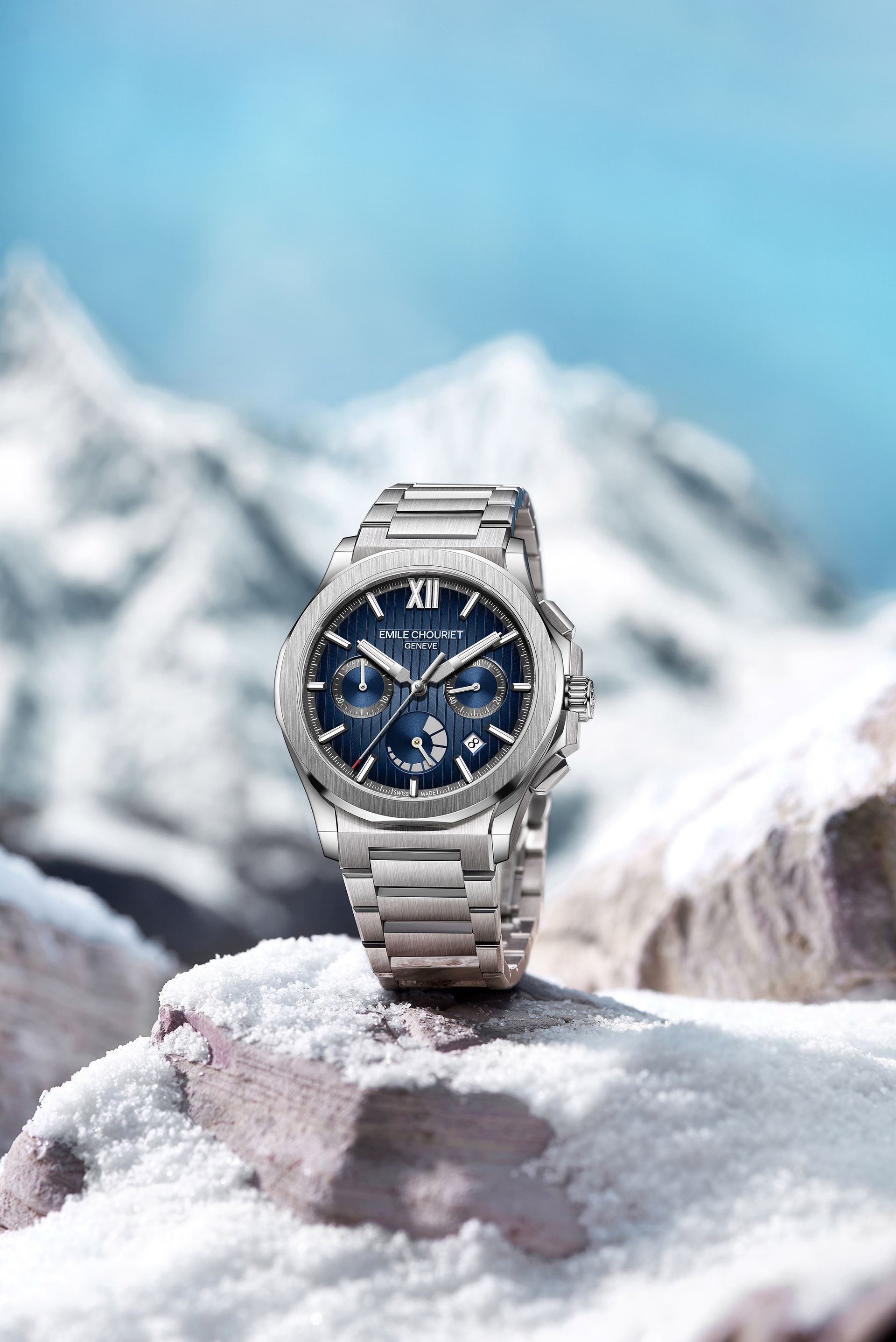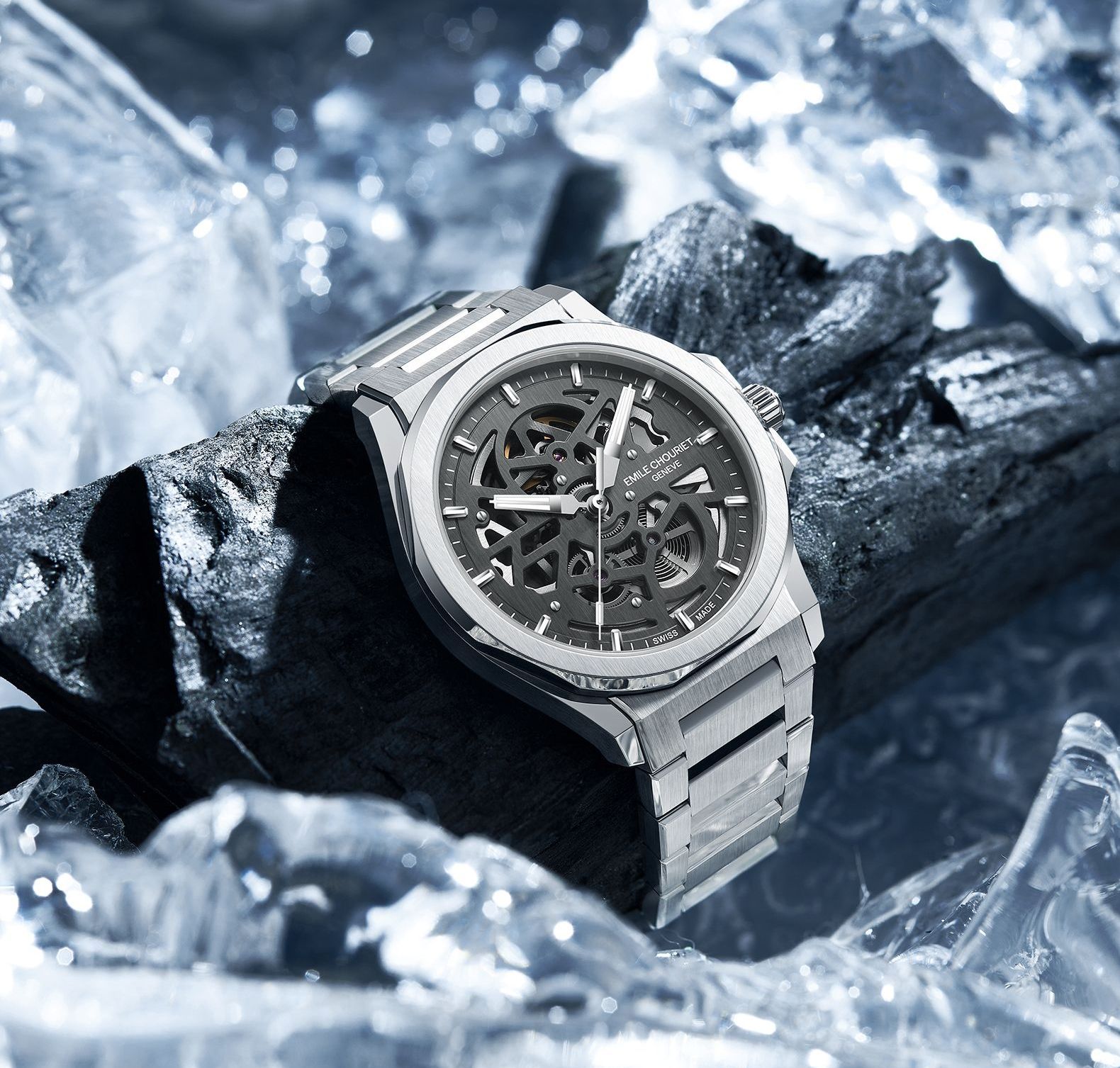 Sportive, résistante et conçue pour s’adapter à n’importe quelle situation, la collection Challenger Cliff d’Emile Chouriet incarne à la perfection la philosophie «Be Free, Be Easy» de la marque genevoise. Les montres Challenger Cliff sont des montres robustes, en acier ou acier PVD noir de 41mm (ou 40 mm pour la Ice Cliff ci-dessous), au verre saphir, fond saphir, aux cadran à chiffres romains et index bruts, étanches à 50 mètres, livrables sur bracelet acier ou cuir (sur demande).