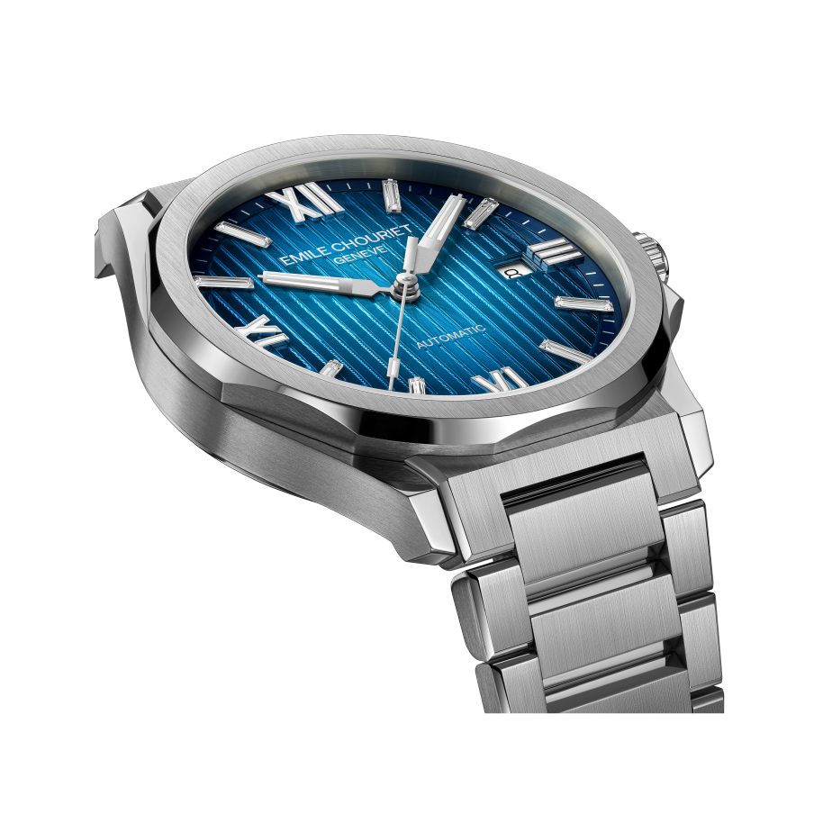Mouvement automatique. Boîtier en acier de 41mm, verre saphir, étanche à 5 atm. Cadran bleu roi rayé verticalement. Bracelet acier avec boucle double déployante.