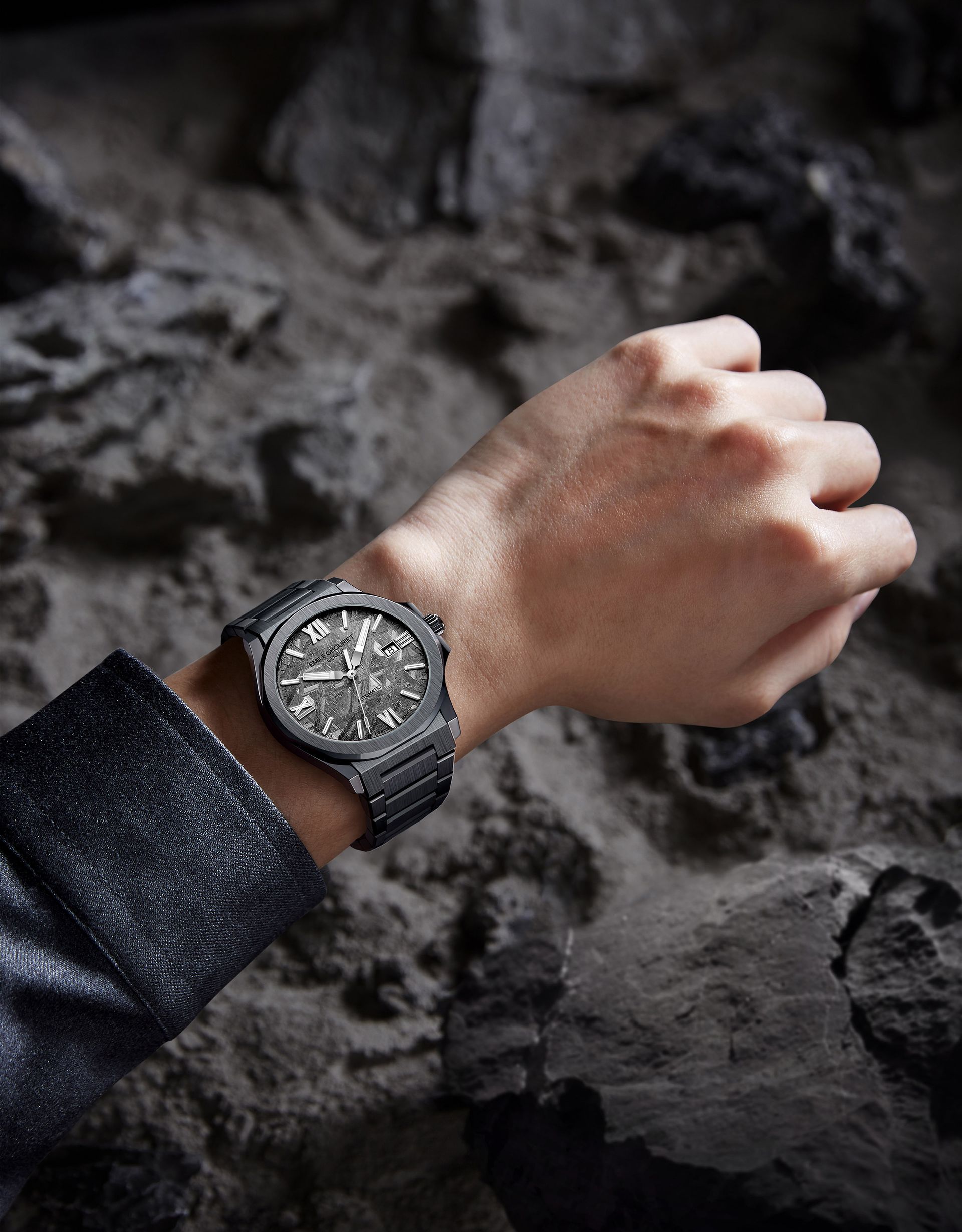 Inspiré par les sommets accidentés et majestueux des Alpes suisses, le boîtier en acier de 41 mm de la Challenger Cliff est recouvert de PVD gris foncé, évoquant l’obscurité profonde du ciel nocturne et du cosmos, dans un contraste saisissant avec le cadran en météorite. Ses lignes géométriques puisantes aux arêtes prononcées confèrent à la montre un aspect très robuste qui fait écho à ses performances. Son étanchéité de 5 ATM (50 mètres) garantit sa résistance dans toutes les conditions. Pour compléter l’ensemble, le bracelet en acier intégré, au subtil fini satiné vertical et aux bords polis, suit parfaitement les lignes du boîtier. La Challenger Cliff est animée par un mouvement automatique suisse, doté d’une réserve de marche de 38 heures lorsqu’il est entièrement remonté, et qui se dévoile à travers le fond en verre saphir. Avec la Challenger Cliff Meteorite, offrez-vous un fragment de cosmos et rapprochez-vous des étoiles !