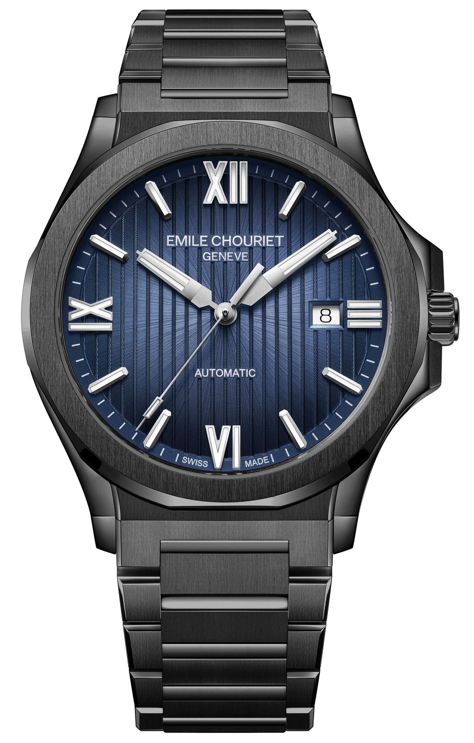 Mouvement automatique. Boîtier en acier PVD noir de 41mm, verre saphir, étanche à 5 atm. Cadran bleu nuit rayé verticalement. Bracelet acier PVD noir et boucle déployante.