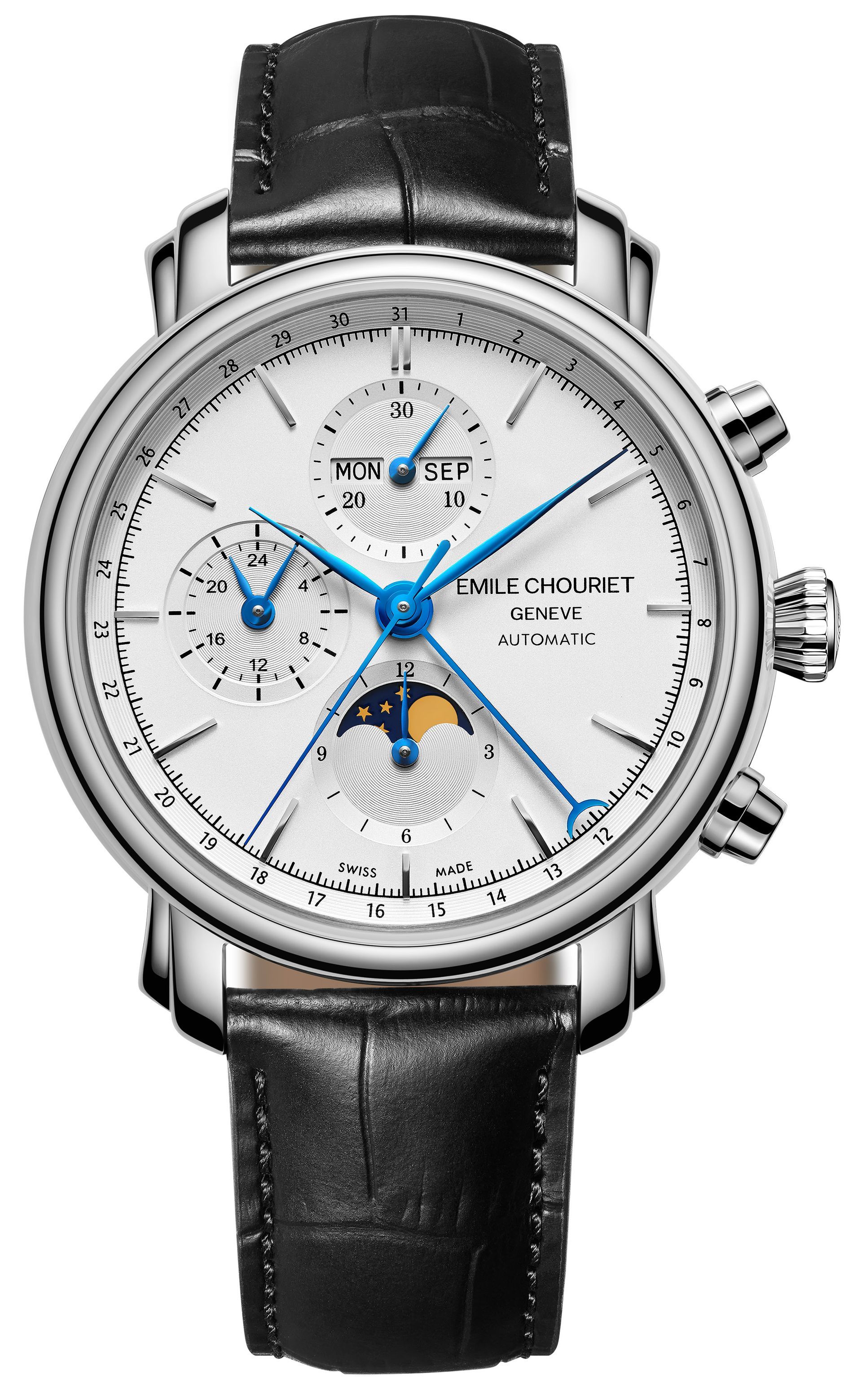 Derrière le fond de boîtier en acier massif se cache le calibre manufacture automatique EC 5378, une variation du calibre EC 5318 – le tout premier mouvement automatique développé et produit en interne par Emile Chouriet. Parfaitement adaptée à la phase de lune, la platine du mouvement accueille directement la complication, évitant ainsi le recours à une construction modulaire. L’équipe de Recherche et Développement de la manufacture Emile Chouriet à Genève a conçu le mouvement afin qu’il soit à la fois robuste et facile à régler. Lorsqu’il est entièrement remonté, il fournit une réserve de marche de 45 heures.