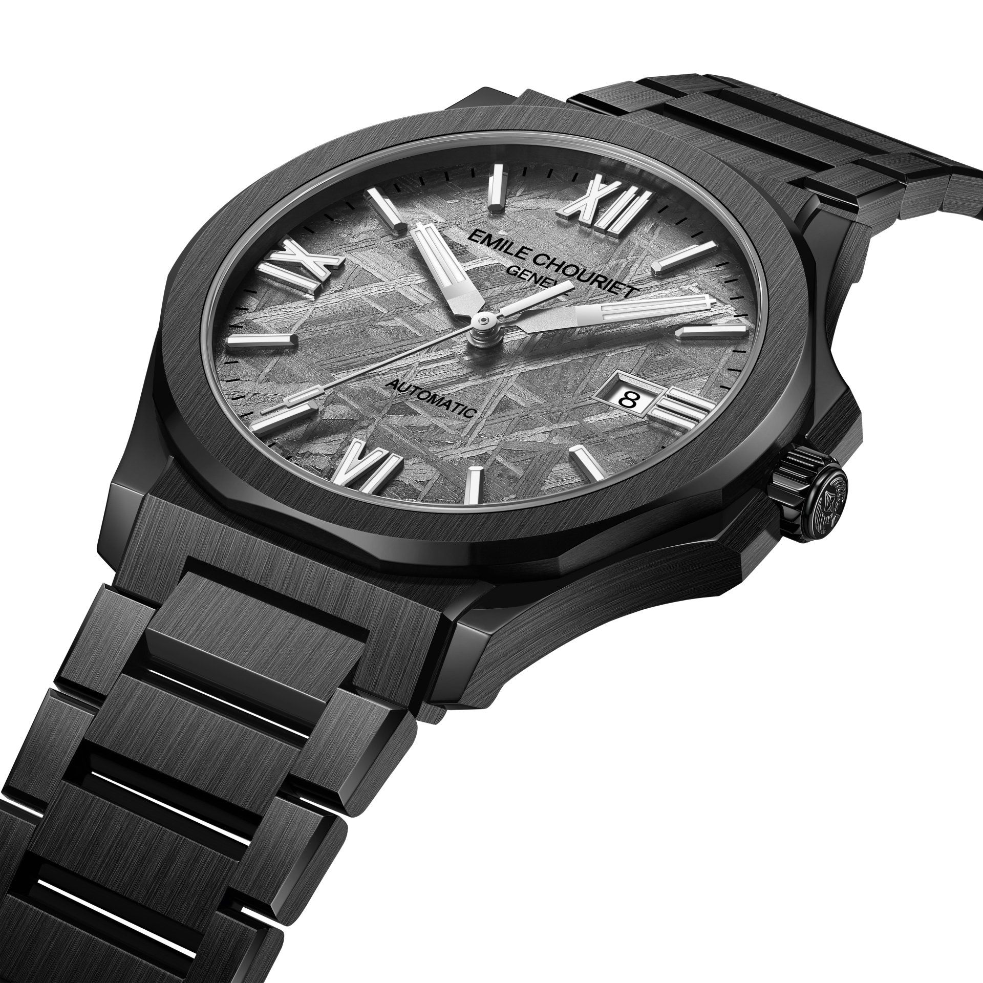 Inspirée par les paysages des Alpes et l’esprit aventurier des alpinistes, la collection Challenger Cliff est conçue pour ceux qui choisissent de vivre leurs passions durant les moments précieux qui n’appartiennent qu’à eux. Avec ce nouveau modèle qui vient enrichir sa collection, Emile Chouriet porte son regard bien au-delà de l’horizon, vers les étoiles. La marque célèbre la fascination des hommes pour l’espace et leur désir d’explorer toute l’étendue de l’univers, à travers une nouvelle édition de la Challenger Cliff qui arbore un cadran en météorite véritable. Le cadran est la pièce maîtresse de cette montre inspirée par le cosmos. Fabriqué à partir d’un météore qui a voyagé depuis les confins de notre système solaire jusqu’à la Terre, ce cadran en météorite gris arbore un motif cristallin qui s’est dessiné naturellement et affiche différentes teintes anthracite sombre et gris argenté. Méticuleusement taillé et poli à la main par des artisans chevronnés pour dévoiler son exceptionnelle beauté, chaque cadran est absolument unique, car il est habillé d’un motif qui lui est propre. Pour offrir une lisibilité optimale de jour comme de nuit, le cadran arbore des index et de larges aiguilles facettés et luminescents, aux surfaces polies et mates, ainsi que deux lignes revêtues de SuperLuminova.