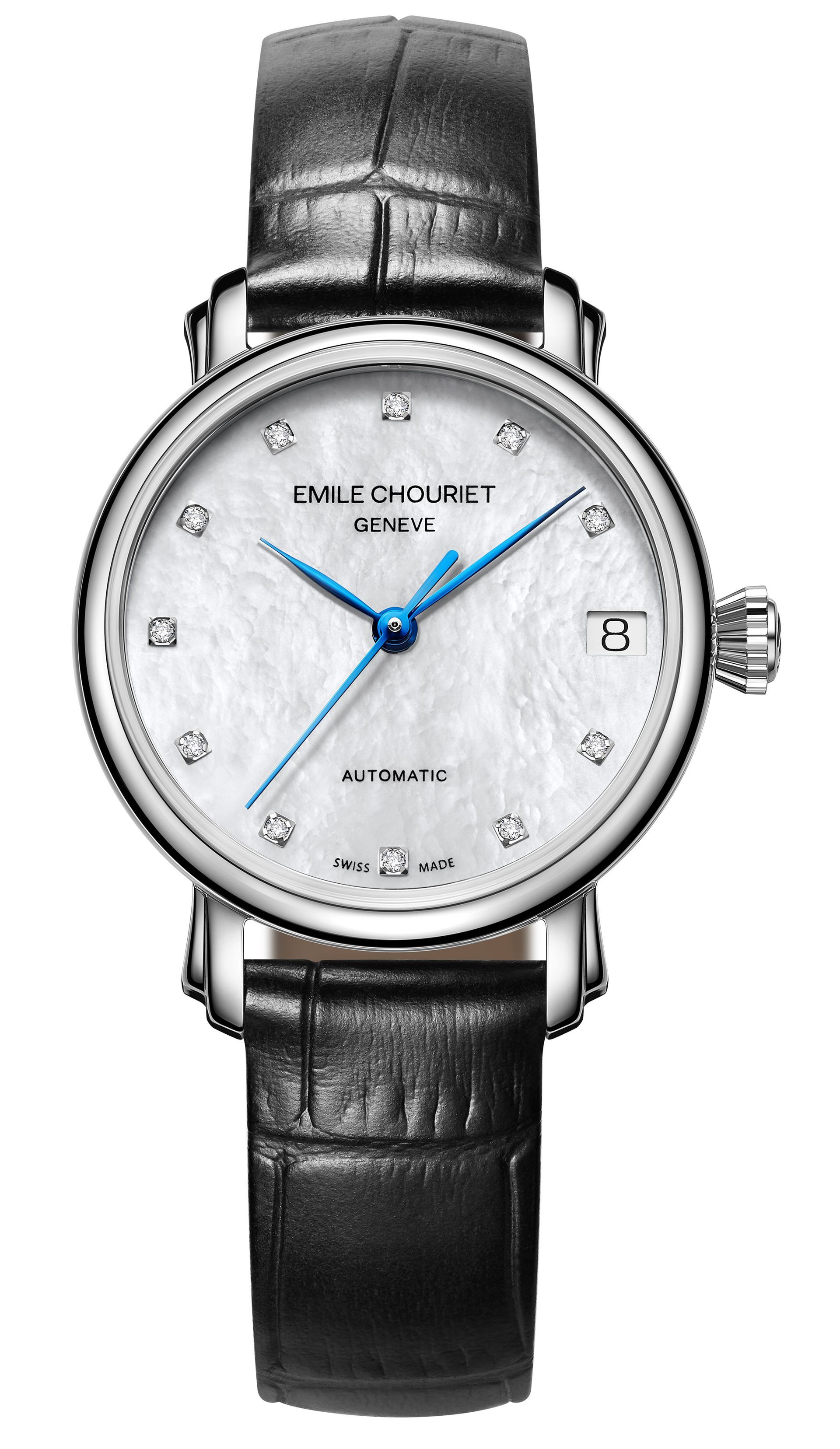 EC9312 automatic movement, 42 hours power reserve, 3 hands, date. 30 mm steel case, sapphire crystal, sapphire case back, water-resistant to 3 atm. Mother-of-pearl dial, TW-VS diamond indexes. Black leather strap, folding clasp.