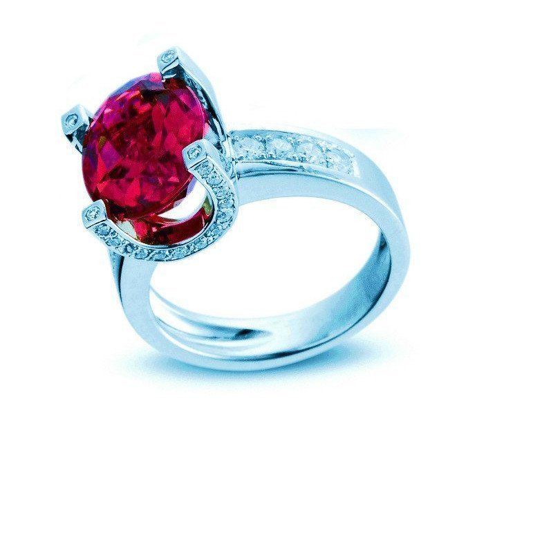 Pink tourmaline from Nigeria, oval 9.57ct, on 800/1000ths white gold setting (14.70gr, body set with two rows of diamonds and cradle set with diamonds, brilliant cut TW-VS/VVS 1.22ct.