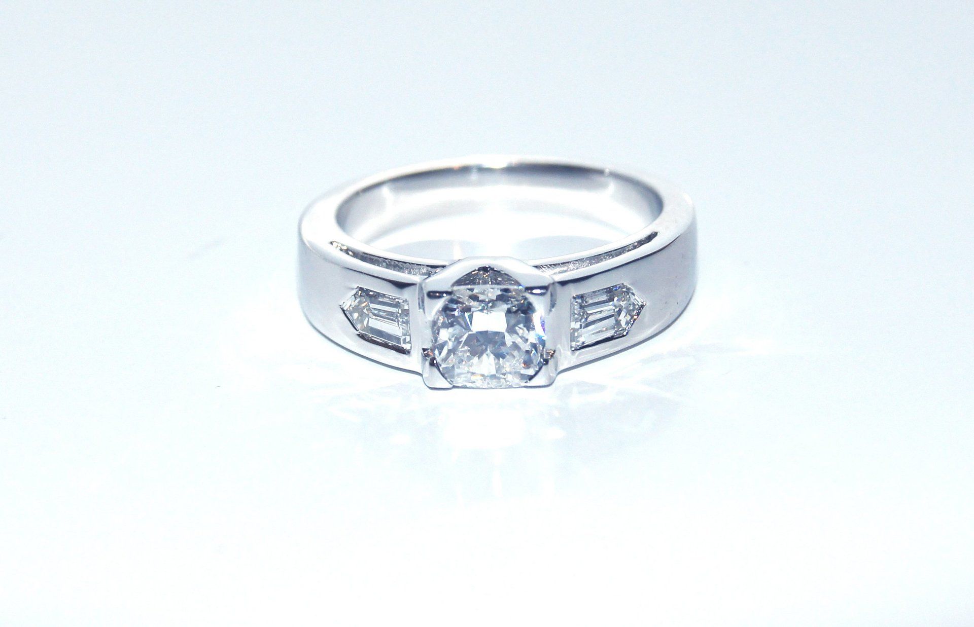in 800/1000ths white gold, sporty setting with a fairly wide and low body, handmade. Cushion-cut diamond of 1.01 ct D SI1 GIA certified, diamonds in the shape of "coats of arms" on the sides, custom-cut.