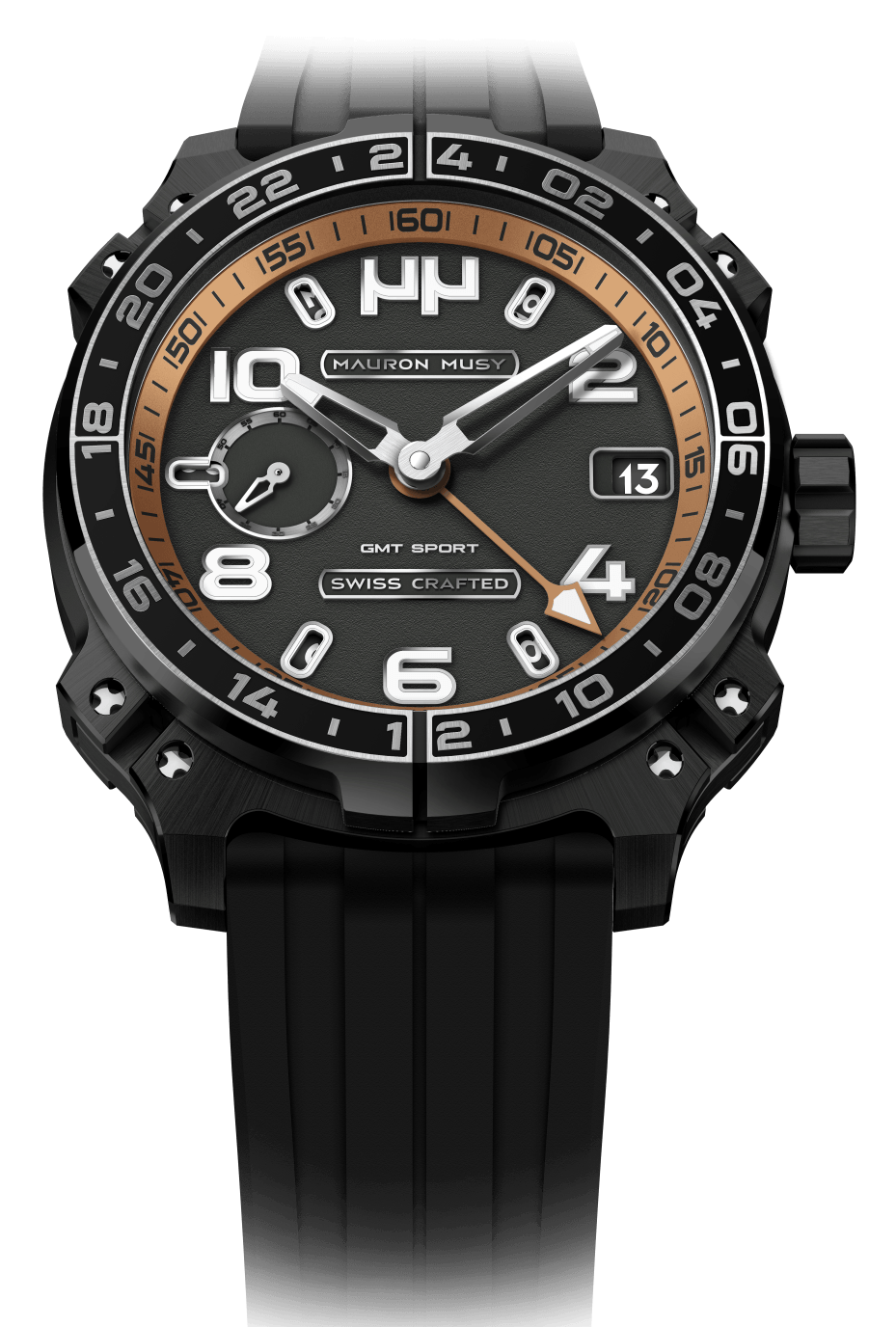 Racy, robust and sophisticated, the new GMT SPORT timepiece created by MAURON MUSY takes the ARMURE collection to new worlds: Sport & Travel. This new model, certified "SWISS CRAFTED" and strongly inspired by racing cars, is equipped with a second 24-hour time zone engraved on a titanium-ceramic bezel.
