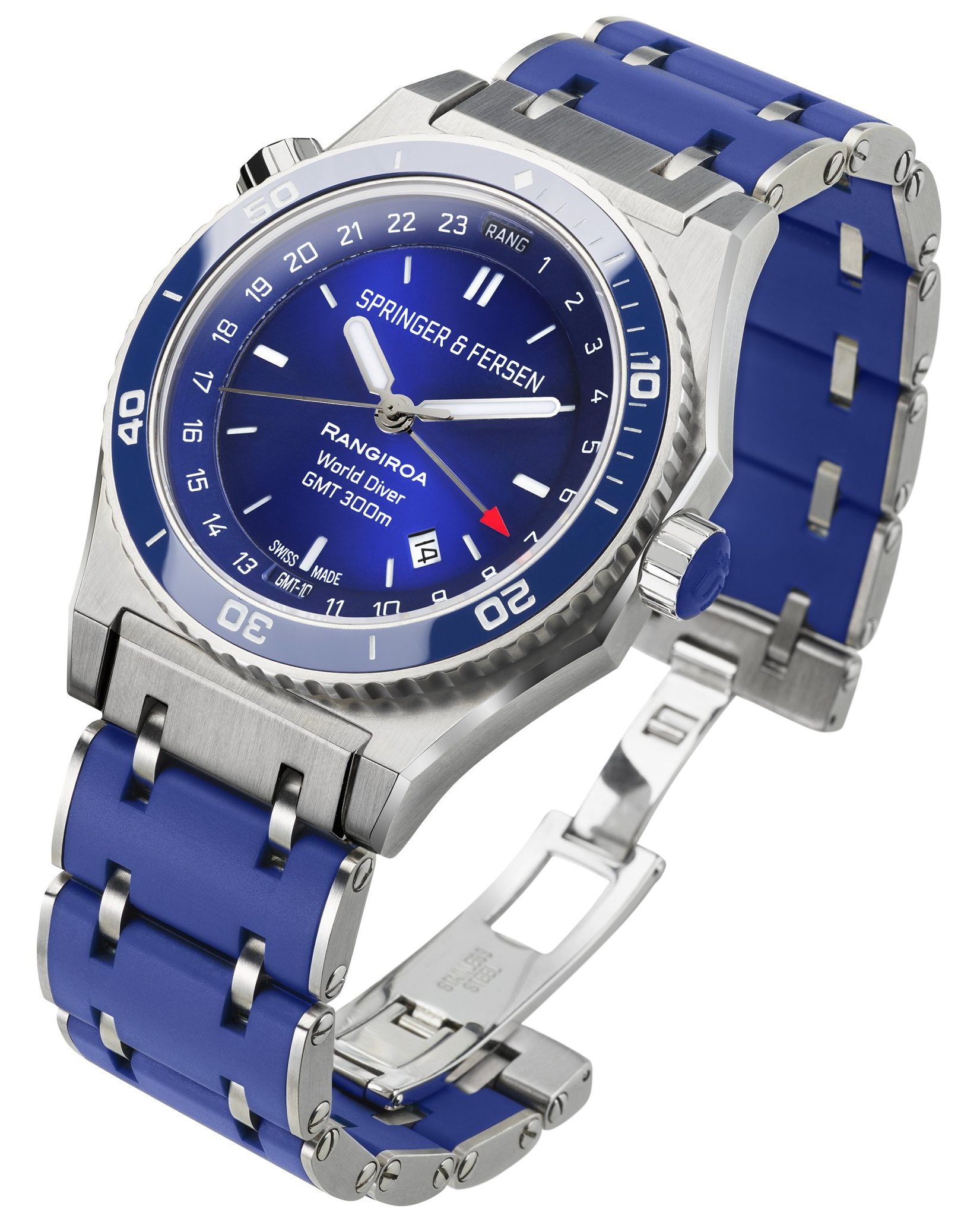Sunray royal blue dial with Swiss Super Luminova® photoluminescent indexes and blue second time zone bezel, steel bracelet and blue silicone.