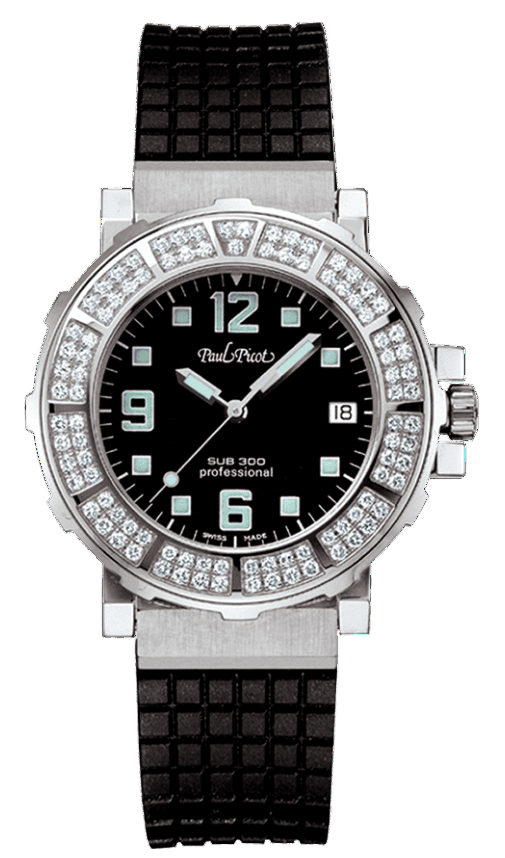 Paul Picot C Type 32 , ref.4042D, P7016.20D.363 32mm steel case, engraved case back, water-resistant to 300 meters, screw-down crown, rotating bezel set with F VVS diamonds, automatic movement, black dial, rubber strap with folding clasp or steel.