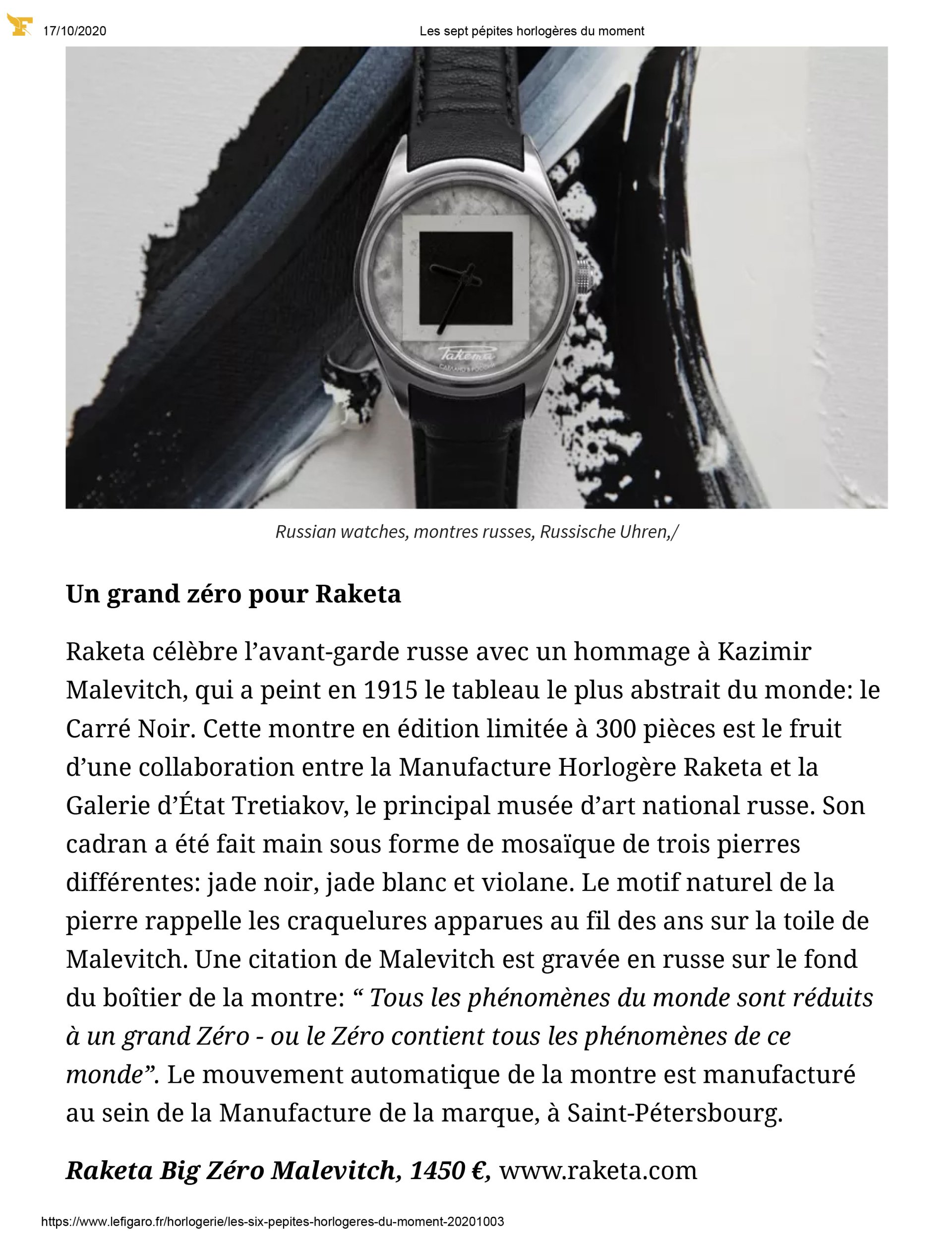 Le Figaro Horlogerie dated October 3, 2020 "Les sept pépites horlogères du moment" (The seven watchmaking nuggets of the moment), extract "Raketa Big Zero Malevitch"