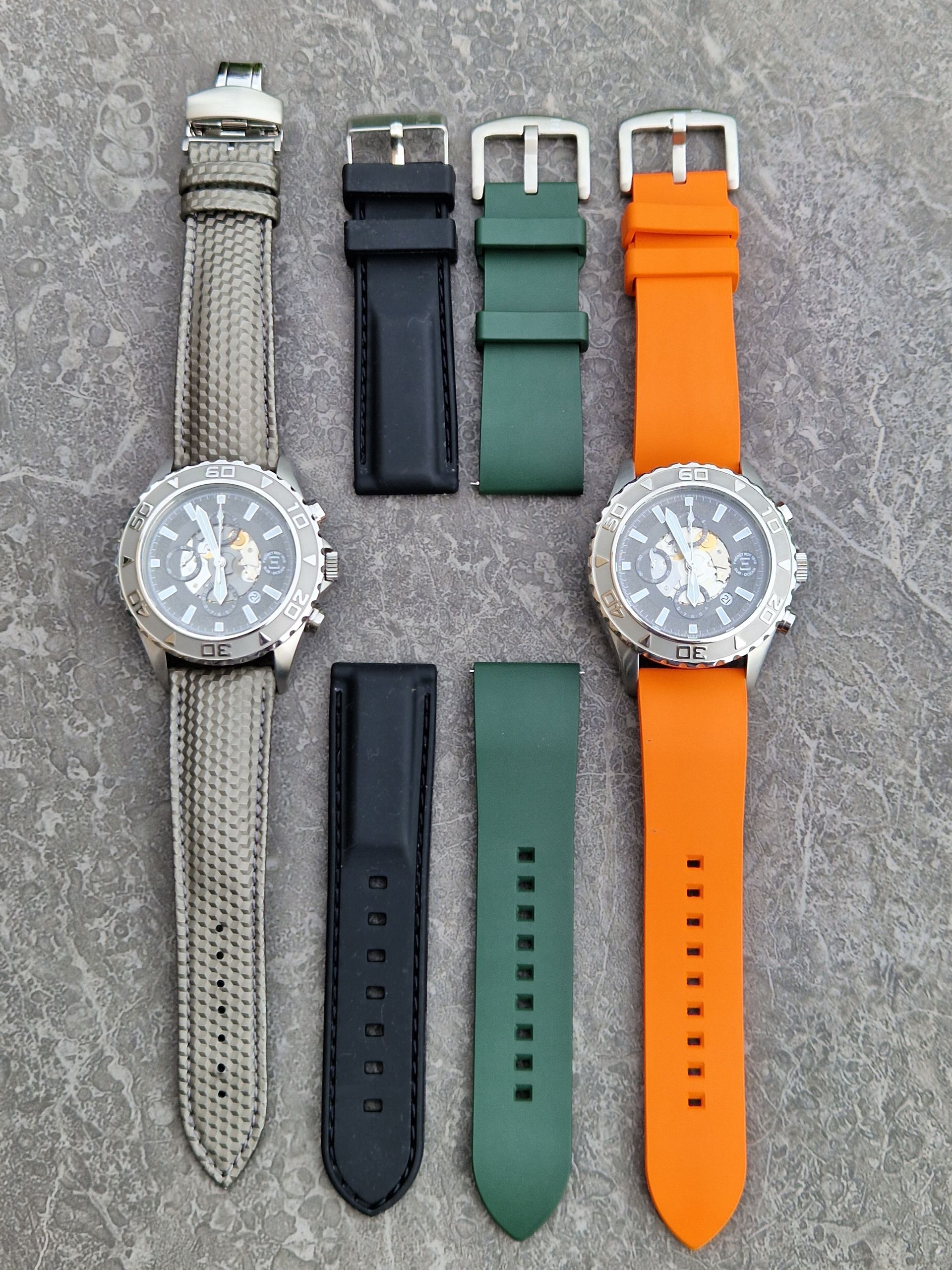 As far as the alligator or rubber strap is concerned, you can choose any of the numerous colors available at the shop.