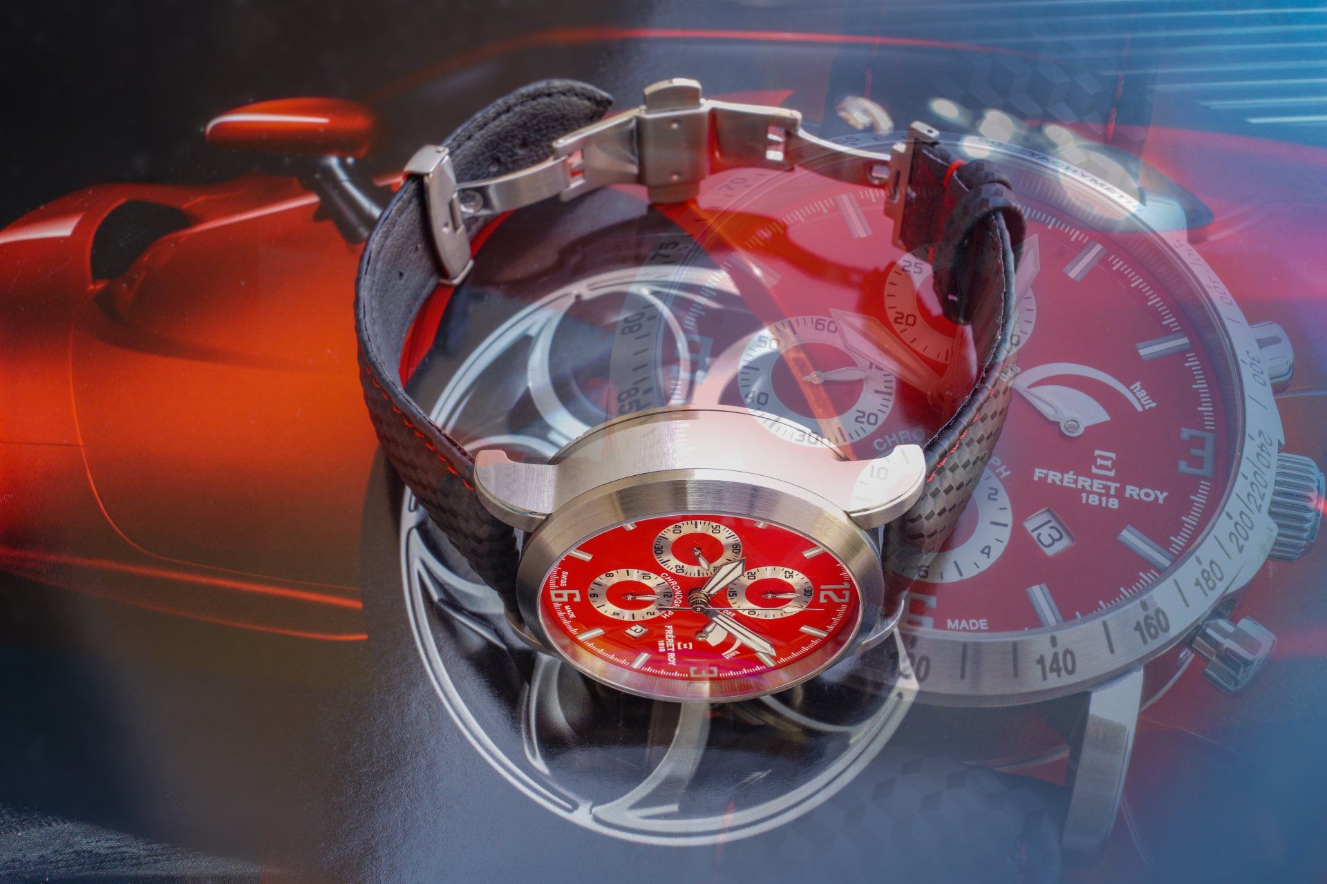 Based on a Valjoux automatic chronograph calibre modified in small series by the Soprod Manufacture, which adds a power reserve indicator at 3 o'clock, we offer this flamboyant chronograph with a red "Ferrari" or "Ducati" dial, dedicated to lovers of fine automobiles or traditional mechanical sports!