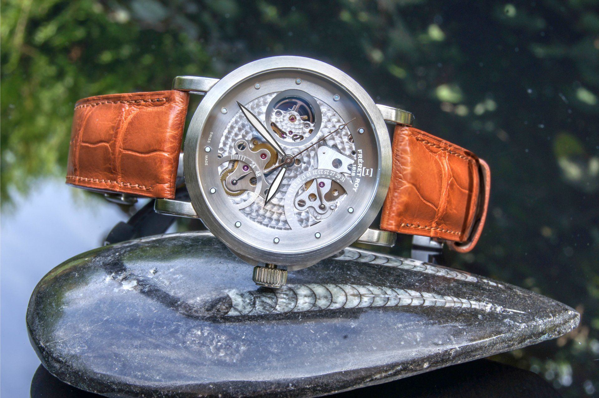 In order to leave the skeletonized movement fully visible, we have placed the brand's logo at 3 o'clock.
