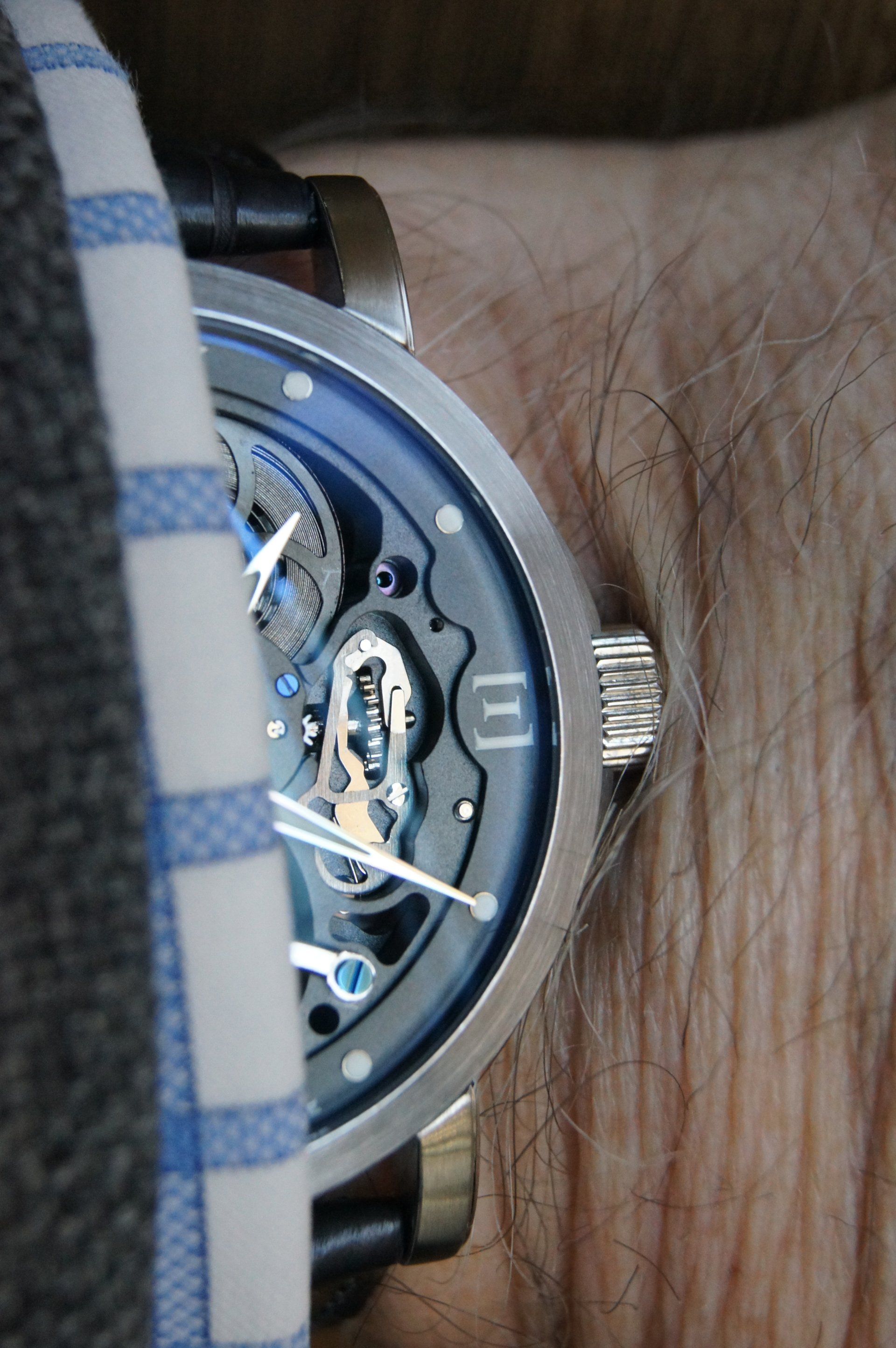 In order to leave the skeletonized movement visible in its entirety, we moved the brand logo to 3 o'clock.