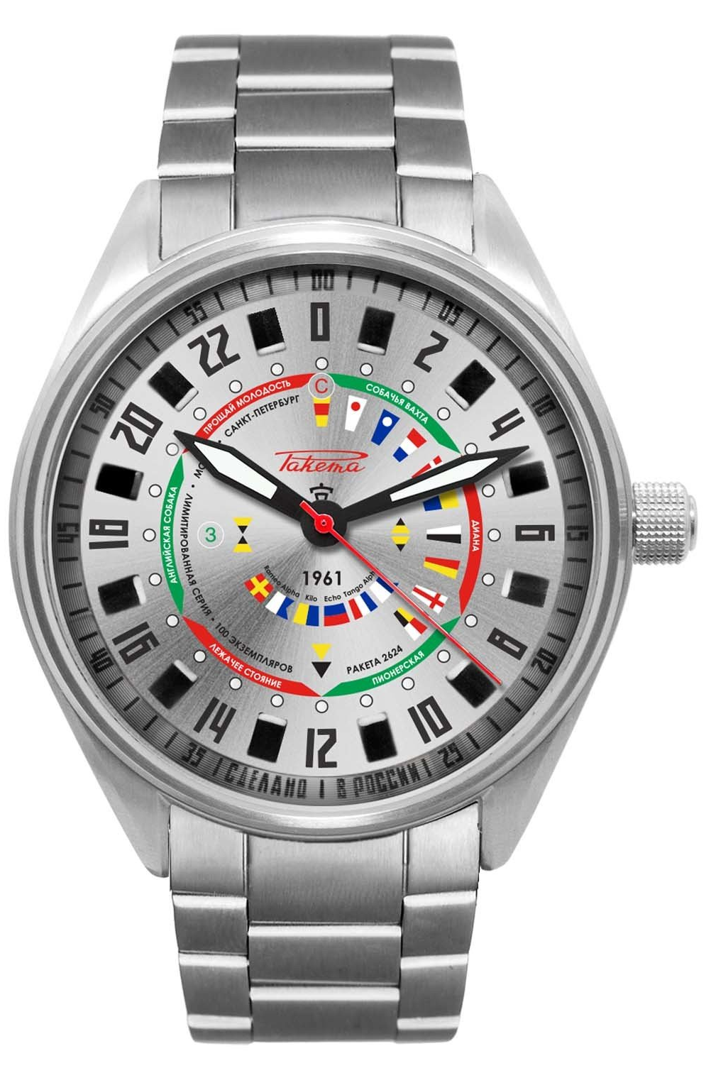 A limited series of automatic Russian watches dedicated to lovers of the sea. The dial of this "Seaman" watch features the maritime cardinal marks used to demarcate dangerous areas, as well as the names of watches with the corresponding time intervals, during which Russian sailors are on watch. The word "RAKETA" and the numbers "0" to "9" are written using the flags of the "maritime alphabet" which is used in the navy to transmit messages between ships. The 24-hour dial allows the watch to be used as a sun compass (by aligning the hour hand towards the sun) which is useful in case the ship's electronic compass no longer works. The 44mm watch case is water-resistant to 200 meters, which makes it perfectly suitable for use by "sailors". The caliber is decorated with painted marine motifs.