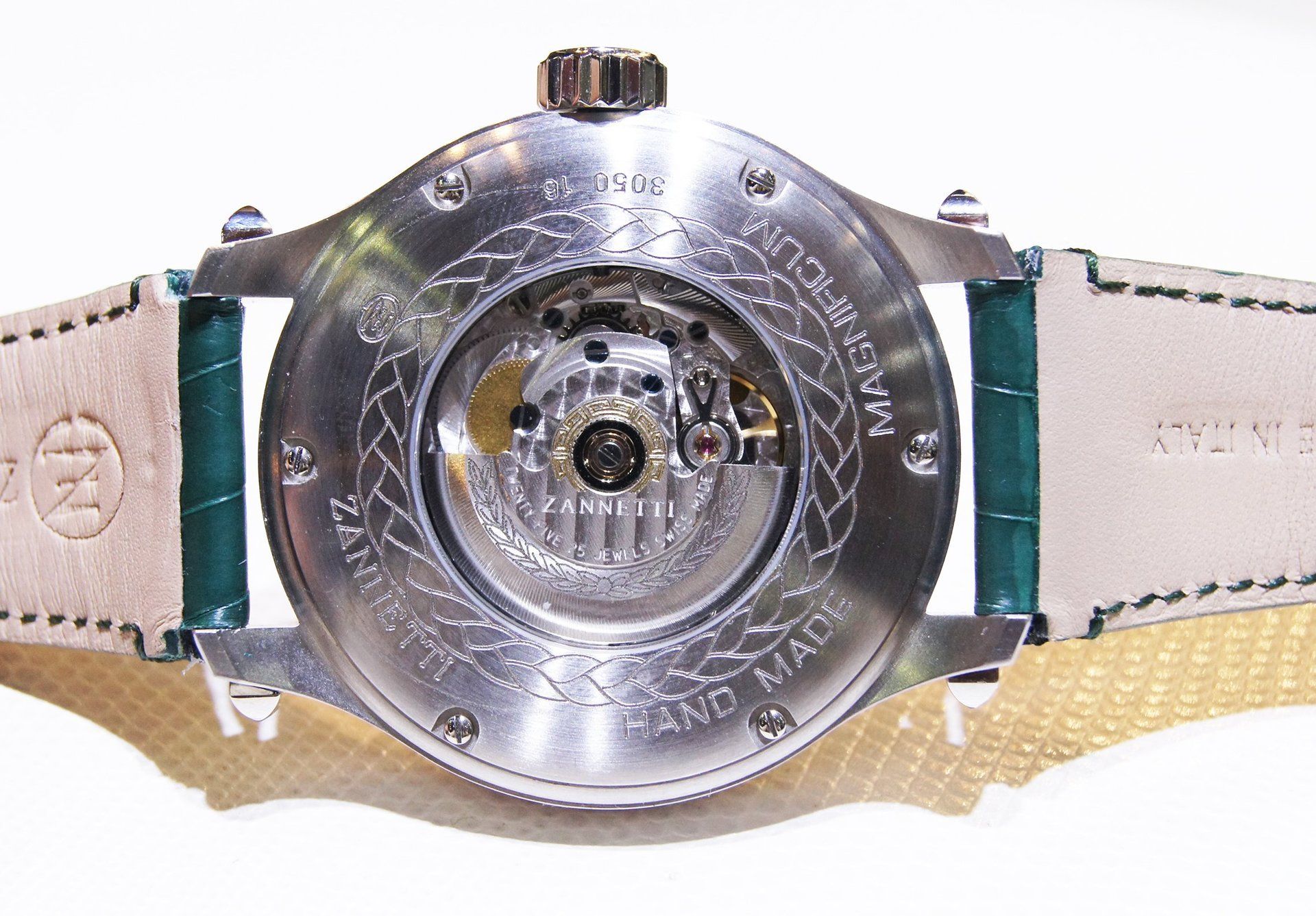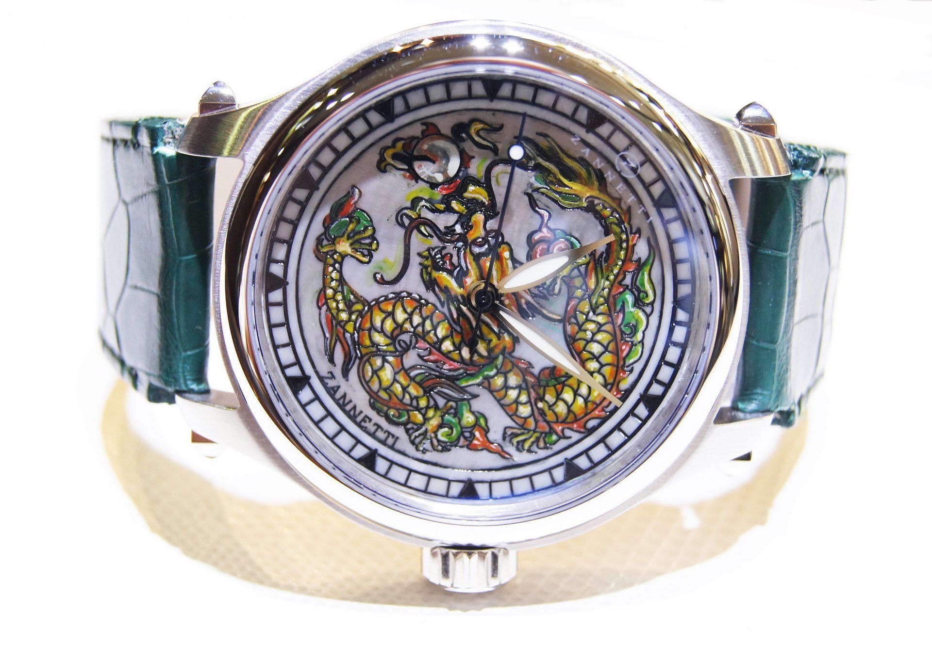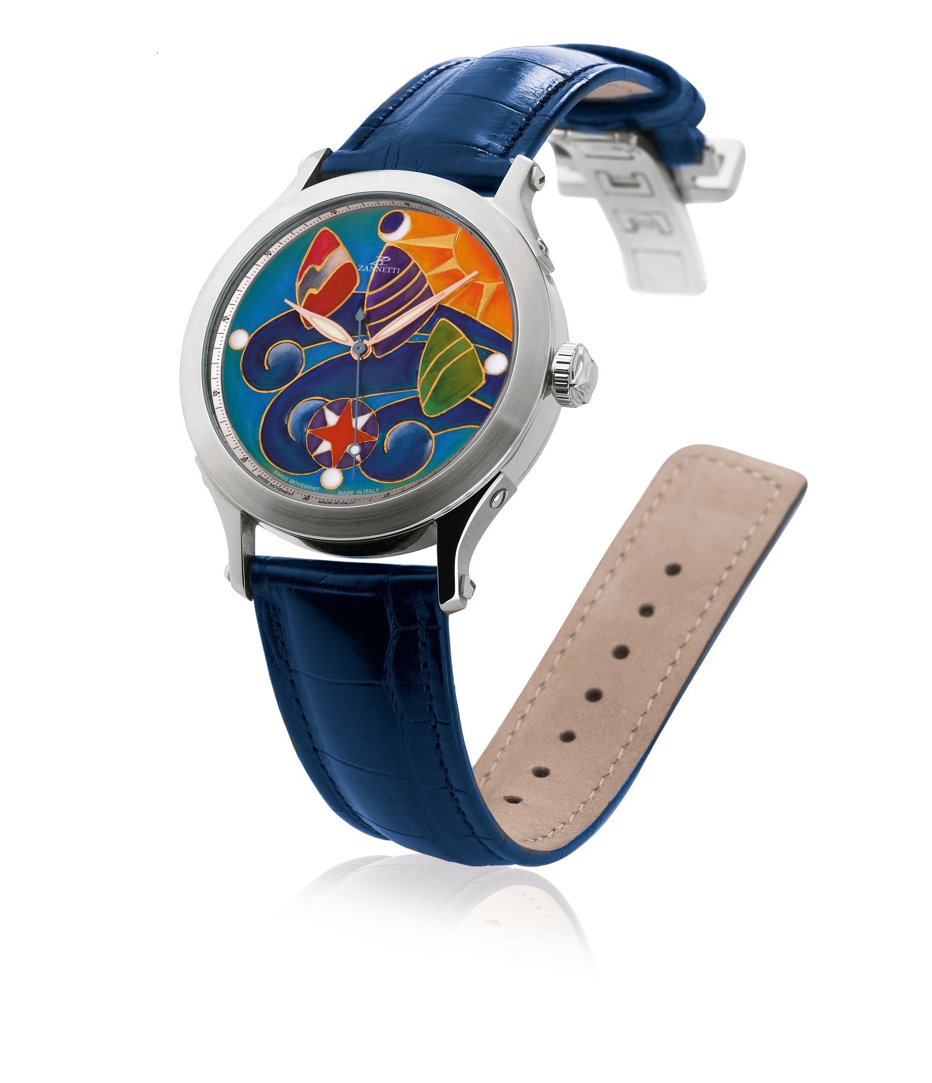 44mm steel case. Hand-worked enamel dial, automatic calibre, alligator strap and folding clasp. Price on request, available.