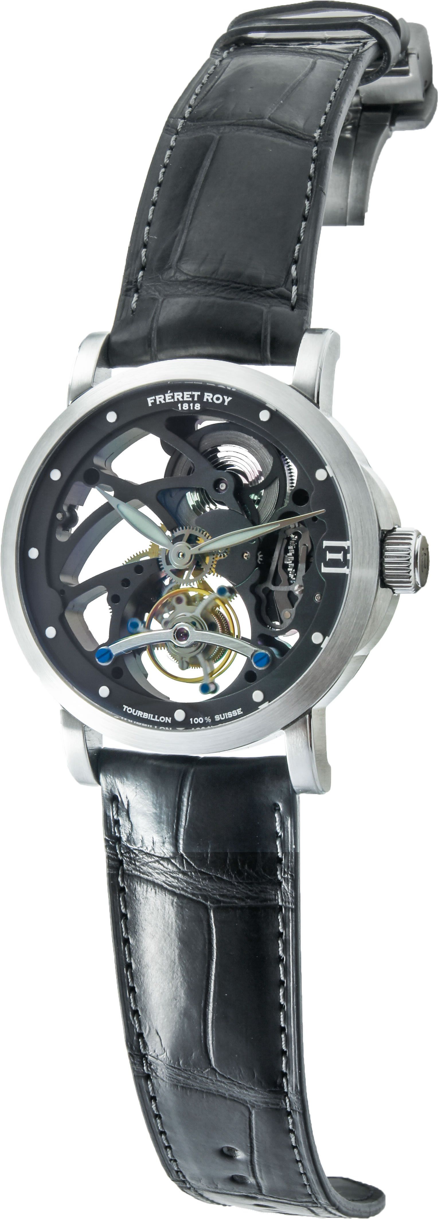 Le dessin du squelette est signé Michel Fréret-Roy, la découpe comme le modèle ont été déposés à l'INPI, Institut National de la Propriété Intellectuelle. Une fois squeletté, le mouvement tourbillon est microbillé puis traité en couleur anthracite ainsi que le réhaut, et le pont du tourbillon à 6 heures , dont la forme rappelle un pont et aussi les "arches" du mouvement, est terminé au rhodium. Les vis du mouvement sont en acier bleui.