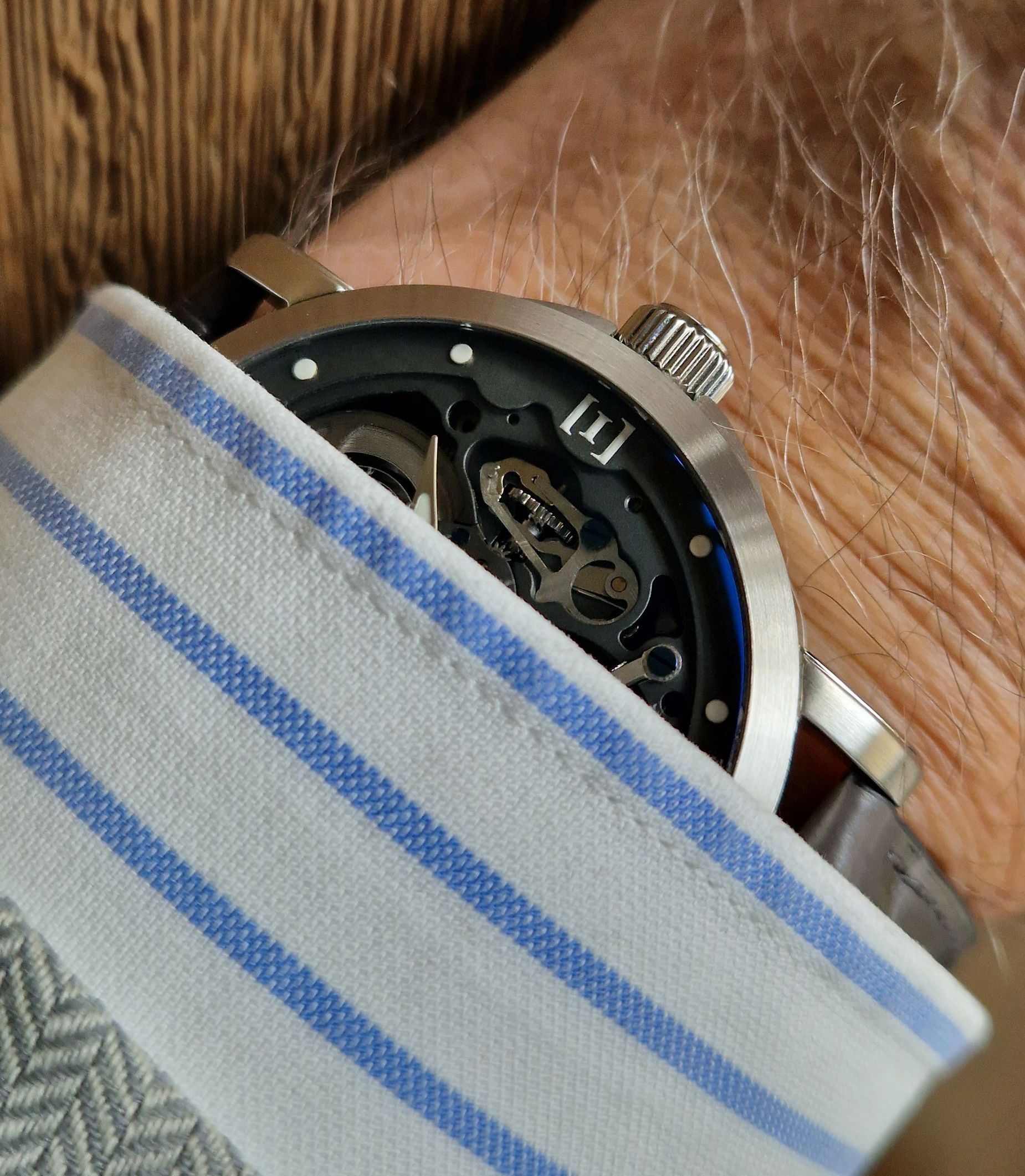 Notre logo qui ressemble à s'y méprendre au chiffre romain "III", trouve légitimement sa place à cet emplacement stratégique que l'on ne peut manquer de voir dès que la manche de chemise dévoile partiellement la montre ! Un logo signature qui parle de lui-même, un signe d'identification fort. Les heures sont indiquées par des "capsules" serties, remplies à la main de superluminova bleu dont la couleur est assortie aux aiguilles feuilles.