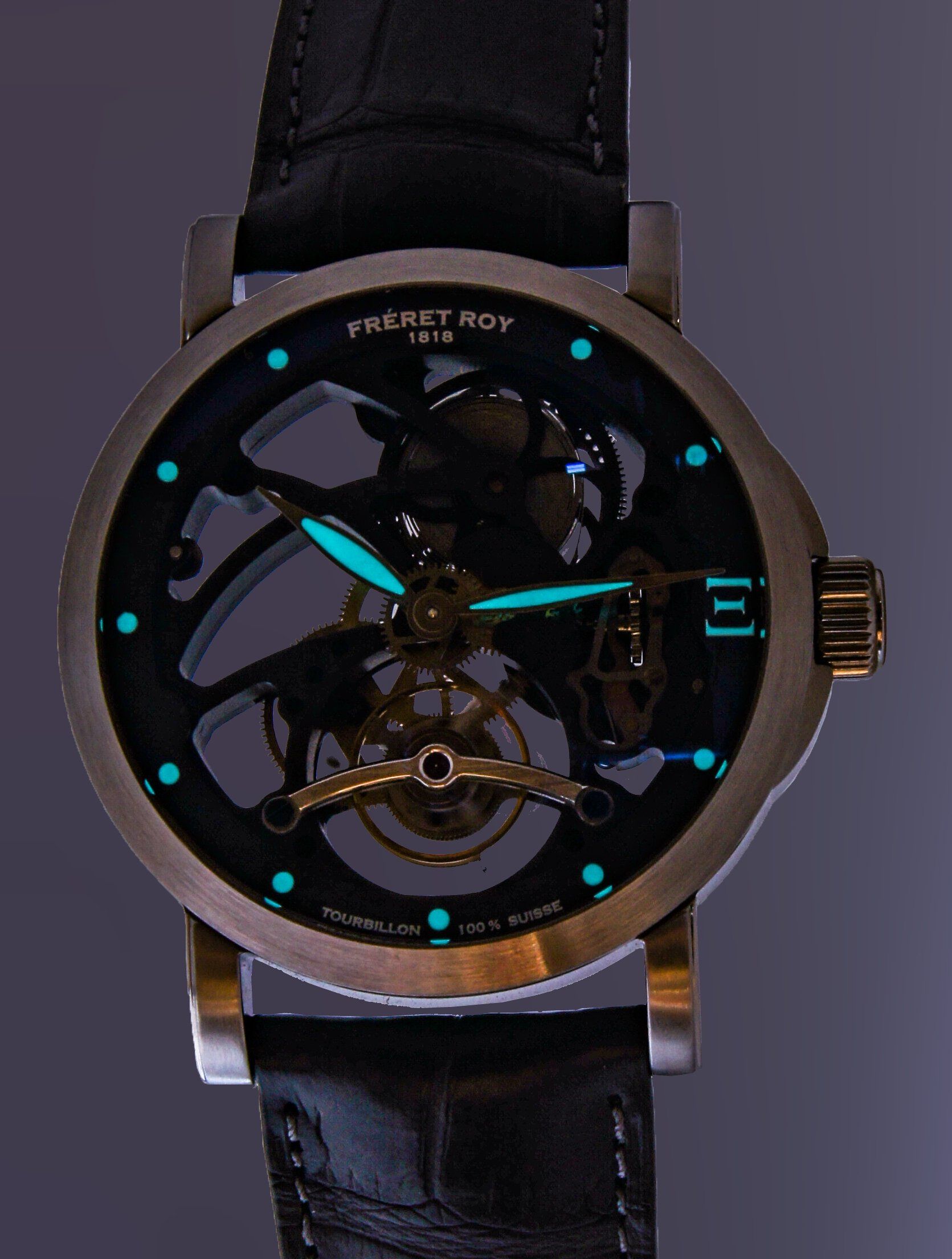 Le dessin du squelette est signé Michel Fréret-Roy, la découpe comme le modèle ont été déposés à l'INPI, Institut National de la Propriété Intellectuelle. Une fois squeletté, le mouvement tourbillon est microbillé puis traité en couleur gris anthracite ainsi que le réhaut, et le pont du tourbillon à 6 heures , dont la forme rappelle un pont et aussi les "arches" du mouvement, est terminé au rhodium. Les vis du mouvement sont en acier bleui.