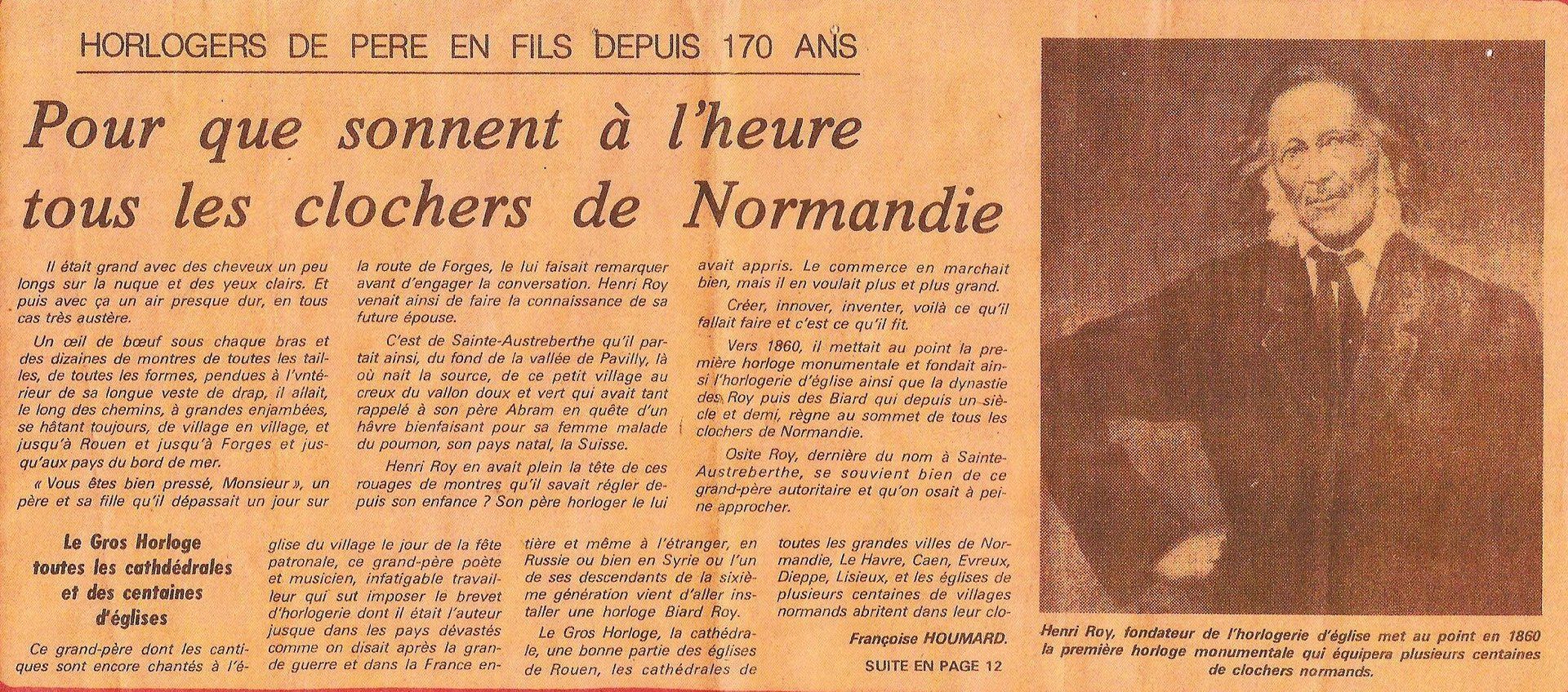 J'avais même investigué très sérieusement lorsque je travaillais comme analyste financier (eh oui!) dans une banque en Normandie, au début des années 1980, alors que j'étais tout jeune diplômé. Rien à faire, introuvables ! Il n'y avait que de nombreuses horloges monumentales en haut des clochers d'églises et de beffrois de mairies, parfois de rares horloges de parquet signées Roy ou H. Roy ou Henri Roy. J'en avais même trouvé une dans un hôtel à Caen, mais elle n'était pas à vendre, pas plus que celle des parents d'un mien beau-frère par alliance...
