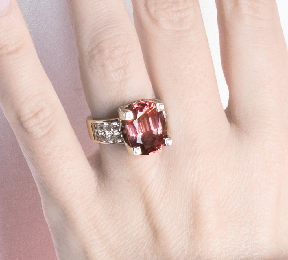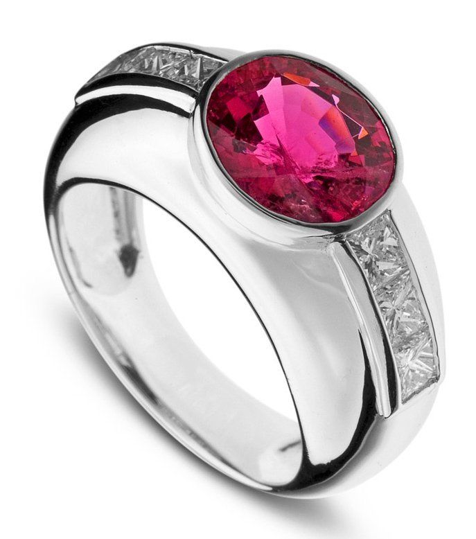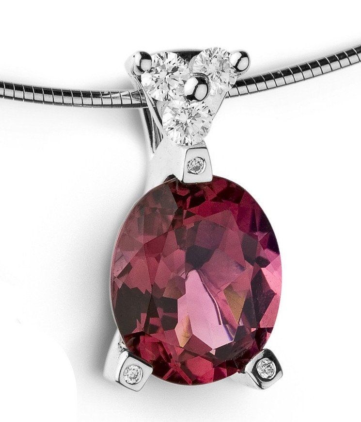 Tourmaline rose du Nigéria, ovale 9,57ct, sur monture or blanc 800/1000èmes (14,70gr, corps serti de deux rangs de diamants et berceau sertis de diamants, taille brillant TW-VS/VVS 1,22ct.