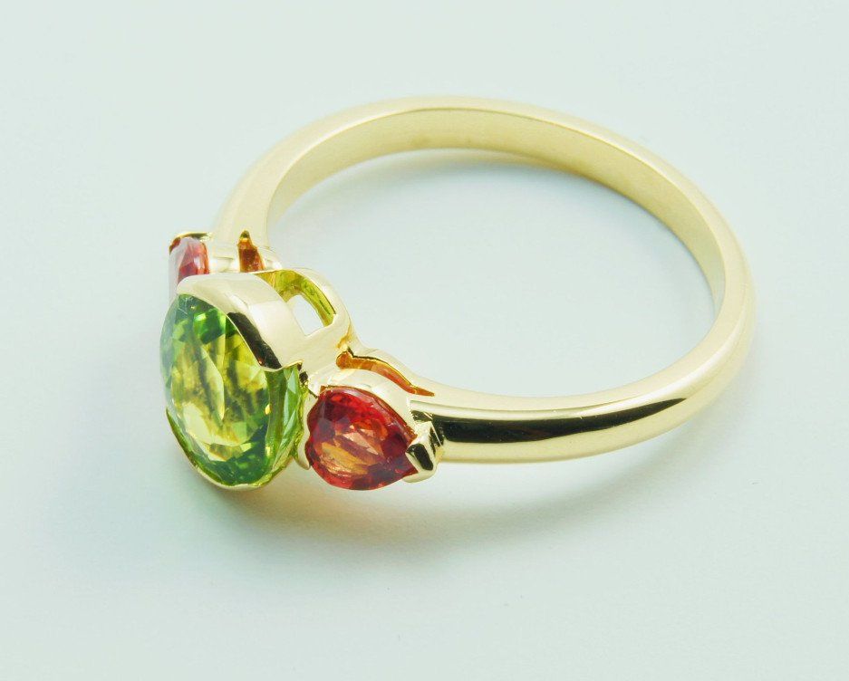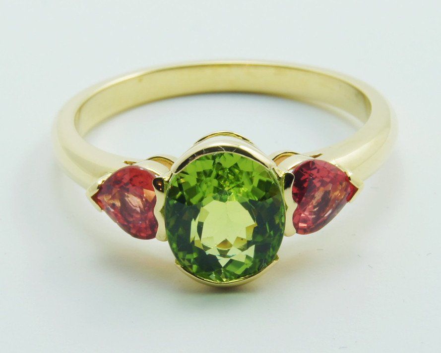 Tourmaline ovale 2,47 ct et saphirs orange de forme coeur 1,01 ct. Vendue. Prix sur devis.