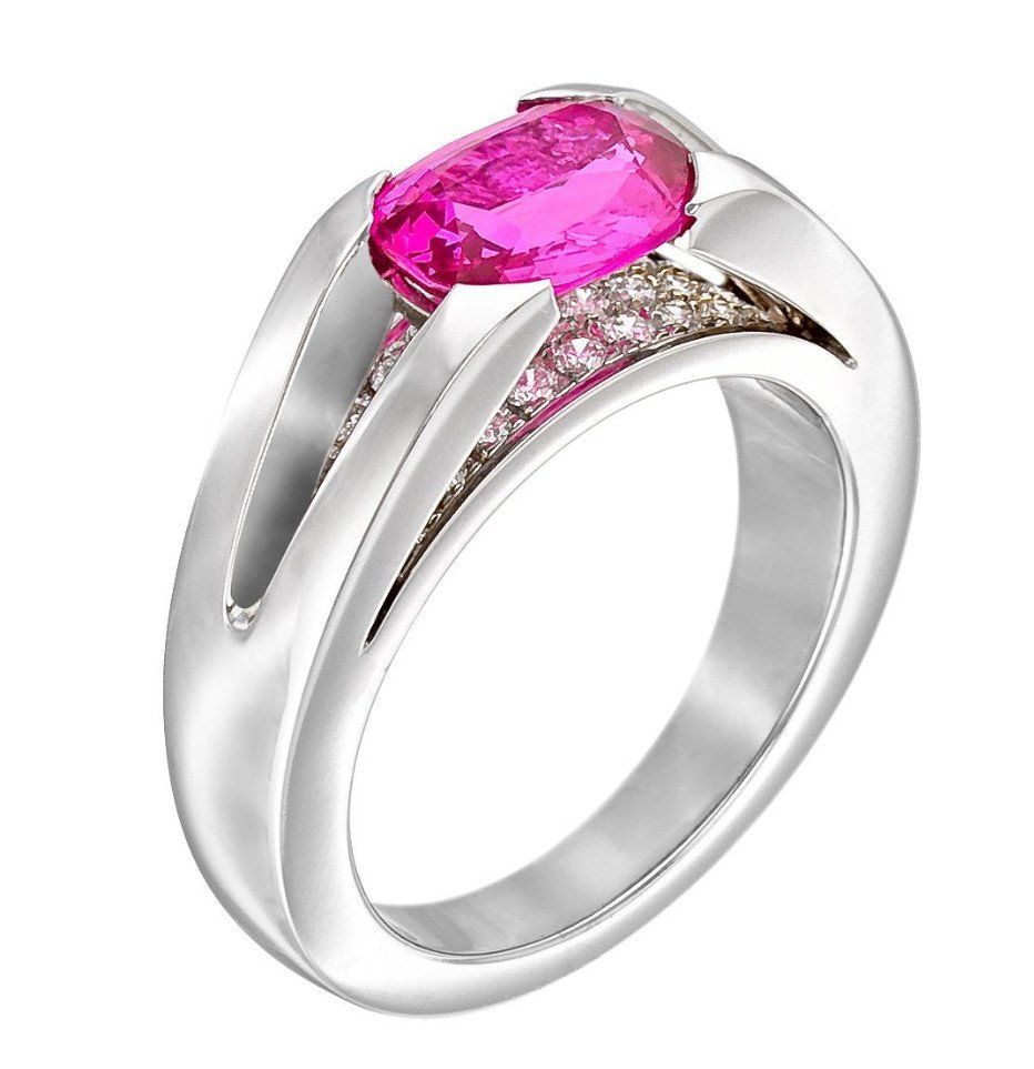 Saphir rose de Ceylan, couleur très vive, de forme coussin, poids 2,10 ct sur monture or blanc 18kts (9,88 gr). Le dessous de la pierre est serti de 0,38ct, TW-VS de diamants. Vendue, prix sur devis .