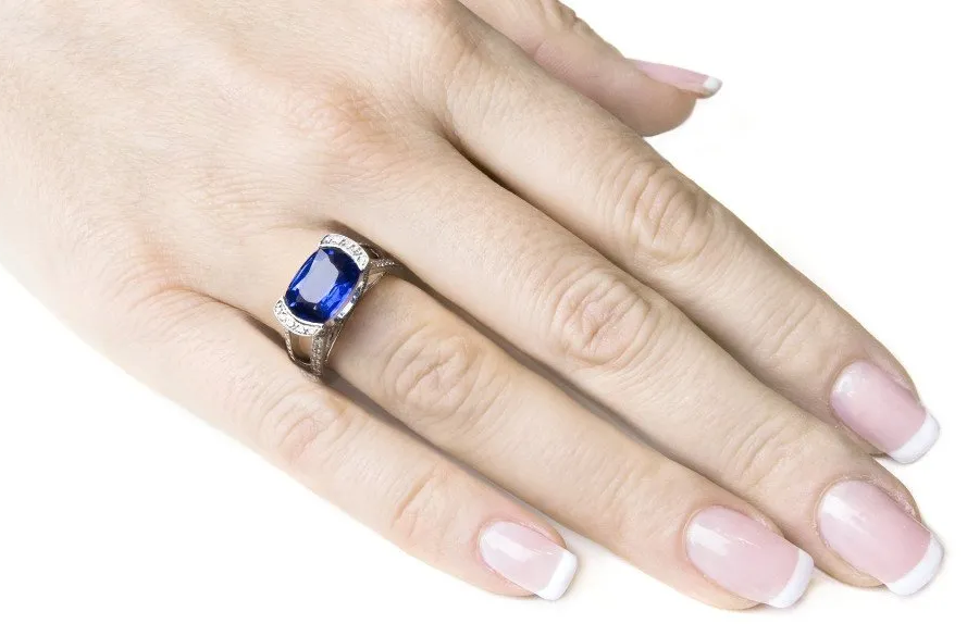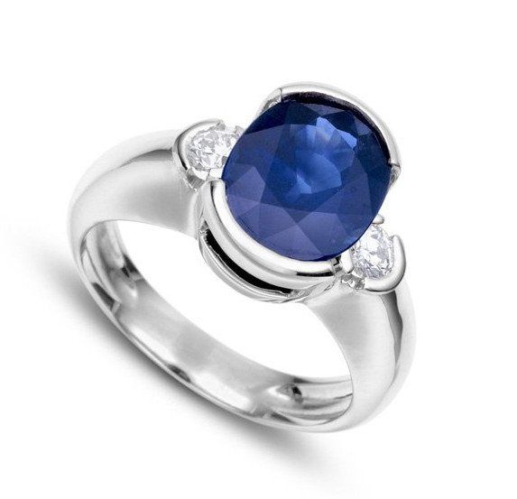Monture en demi-serti clos et pierre positionnée dans le sens de la largeur du doigt. Saphir Ceylan , superbe couleur bleu roi, de 5,01ct, (naturel, chauffé HA), de forme coussin. Bague or blanc 800/1000 (8,05gr), monture sertie de diamants taille brillant TW-VS/VVS 0,58ct. Prix 29850 € TTC, disponible.