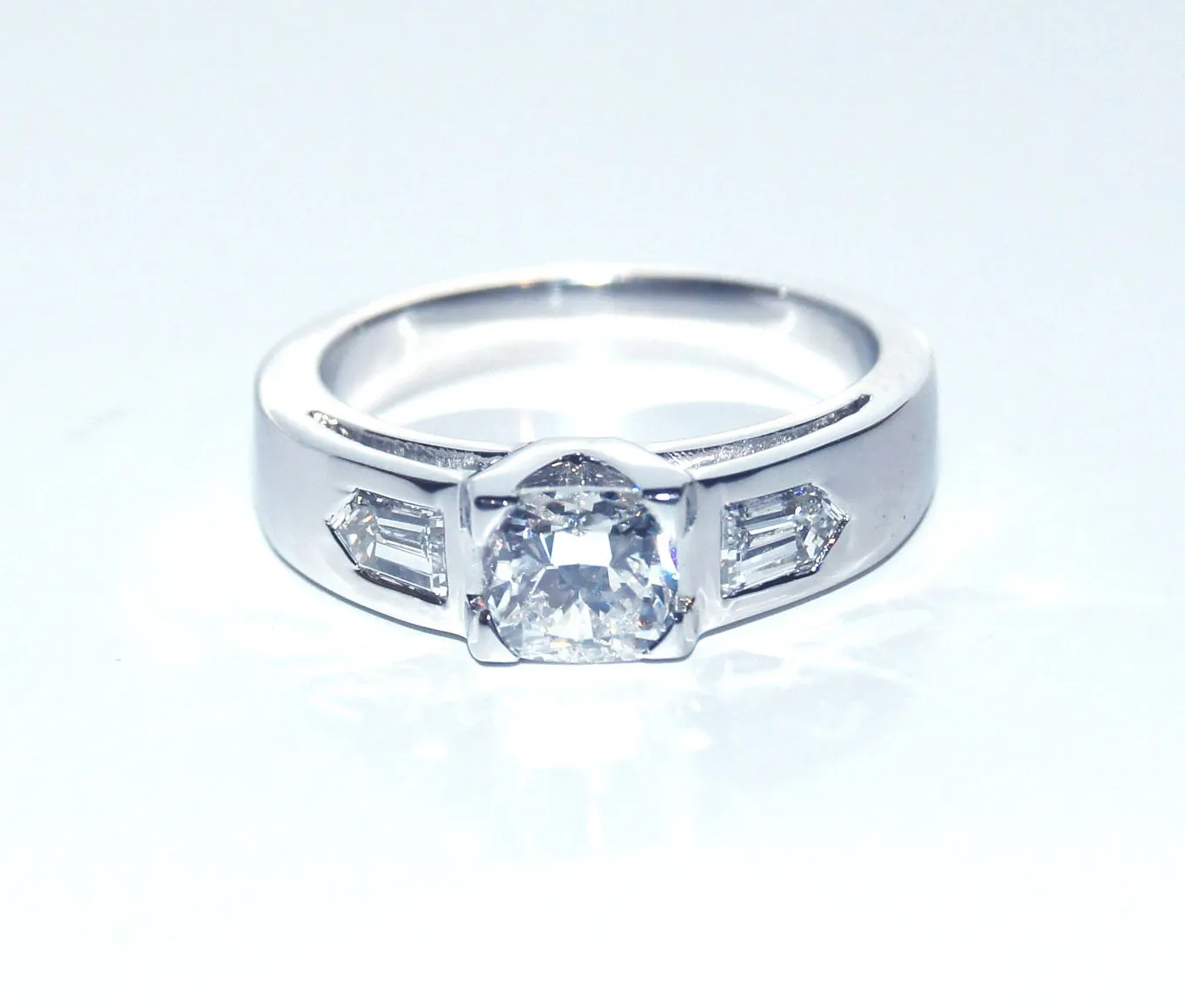 en or blanc 800/1000èmes , monture sportive avec un corps assez large et bas, fait main. Diamant de taille coussin de 1,01 ct D SI1 certifié GIA, diamants en forme de "blasons" sur les côtés, taillés sur mesure.