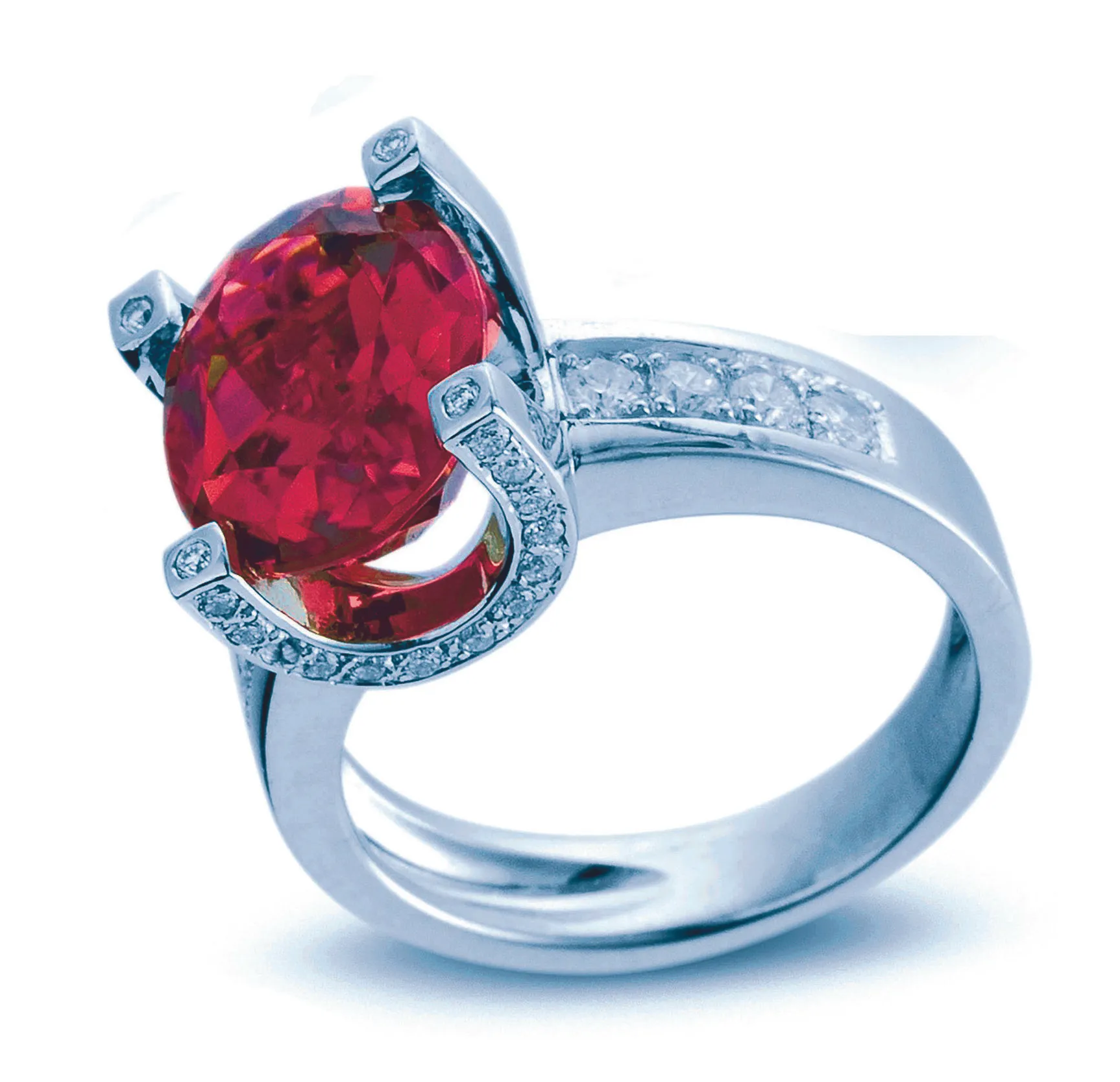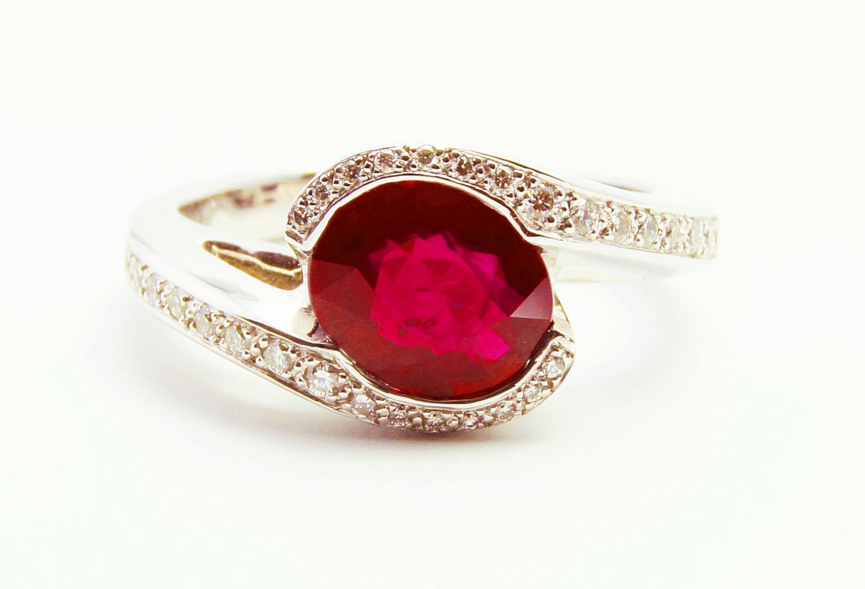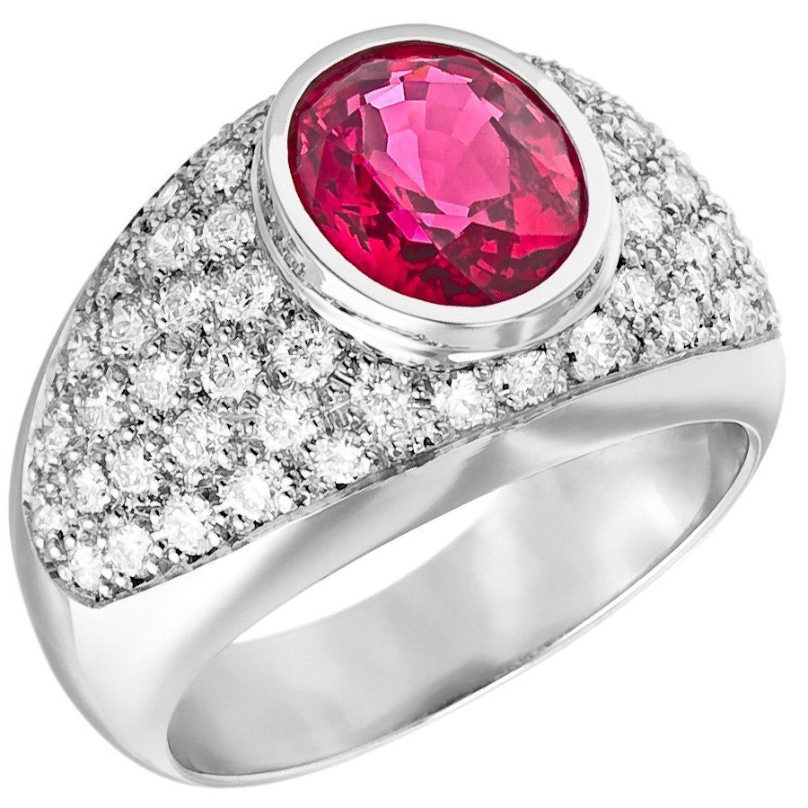 superbe spinelle birman rouge-rosé de 2,43 cts, de forme ovale, en or blanc 18kt avec un important pavage de 0,96 ct TW-VS/VVS .