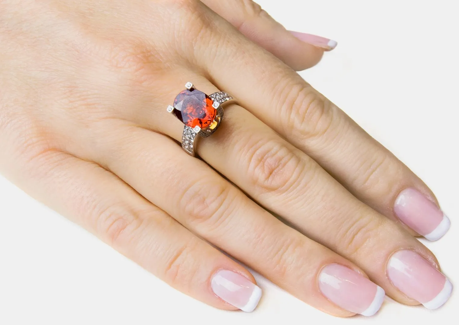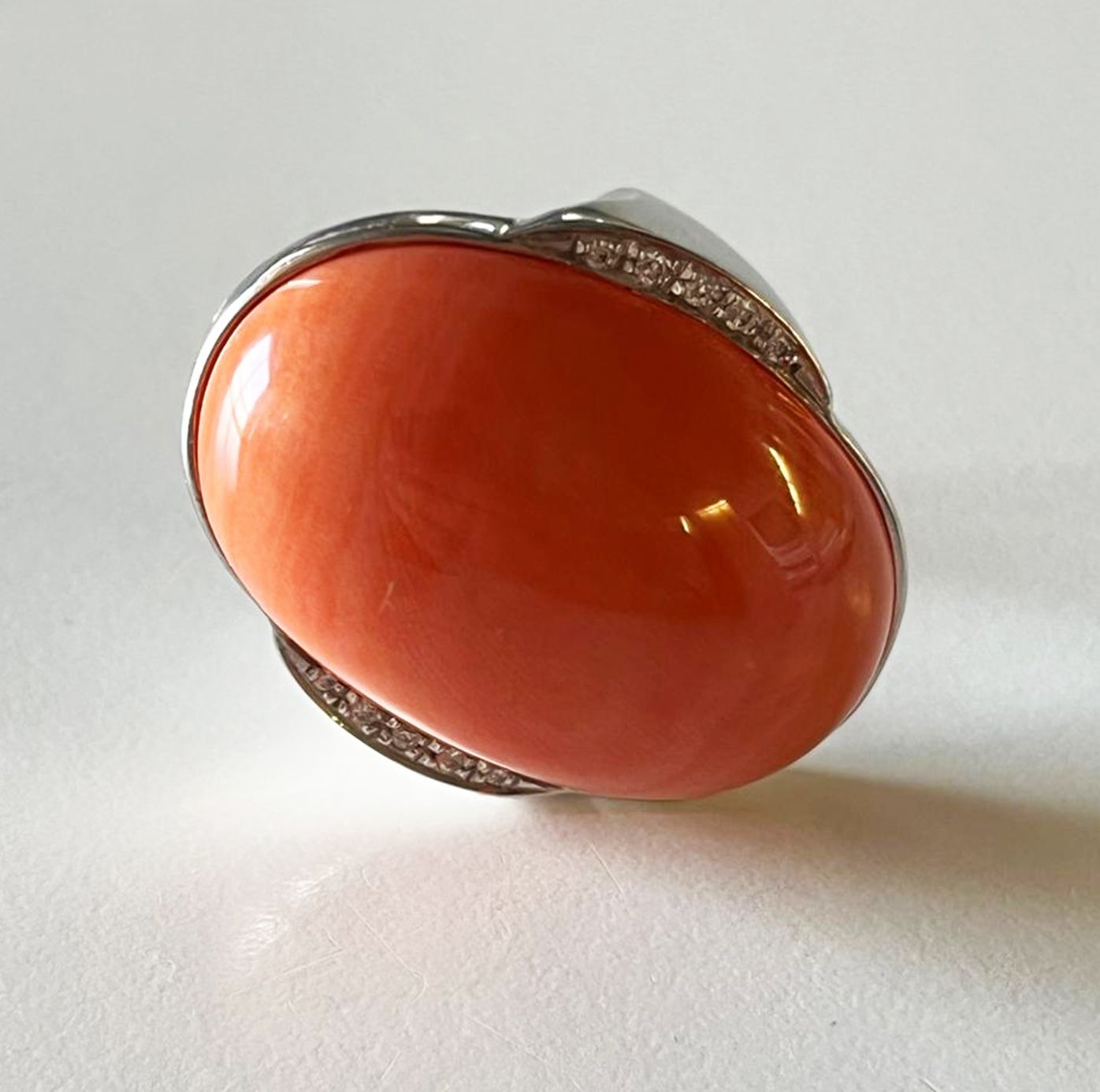 Grenat Spessartite orange sanguine, couleur vive, pierre ovale sans aucune inclusions, 7,72ct, sur or blanc 800/1000èmes (9,85 gr), corps serti de deux rangs de diamants et berceau sertis de diamants TW-VS/VVS 0,66 ct.