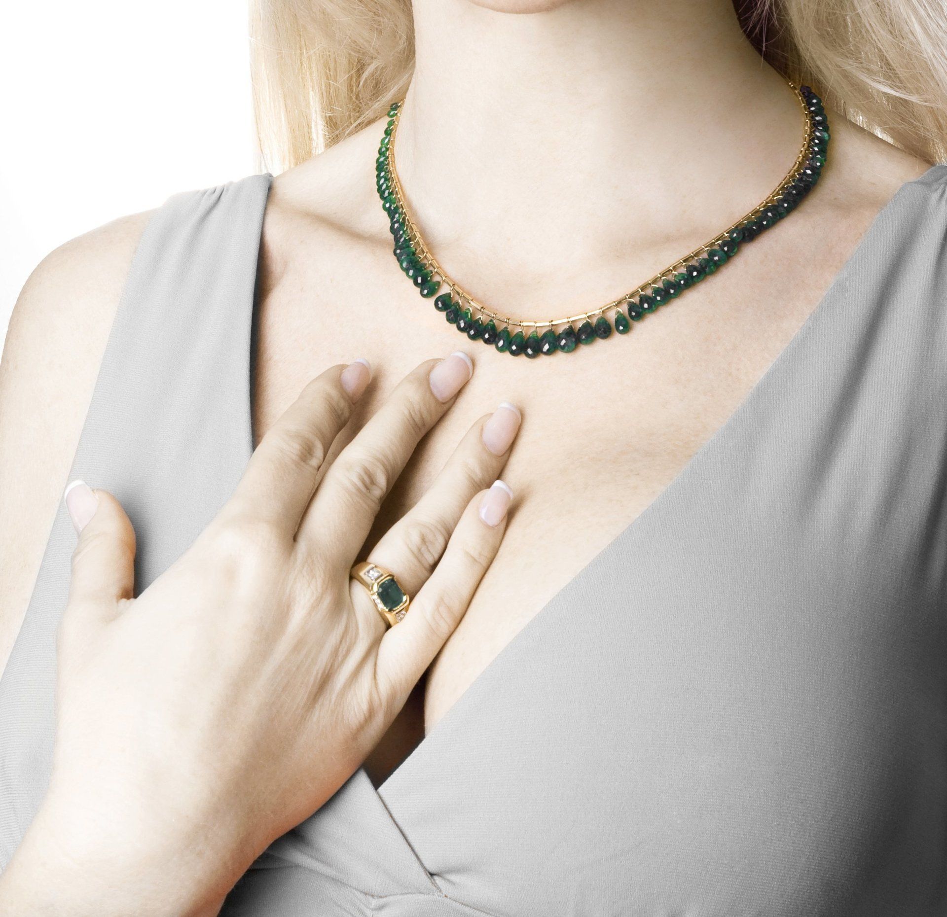Ensemble de tzavorites en chute, de taille briolette et forme poire, de couleur vert intense, pour un poids total de 70,90 ct.