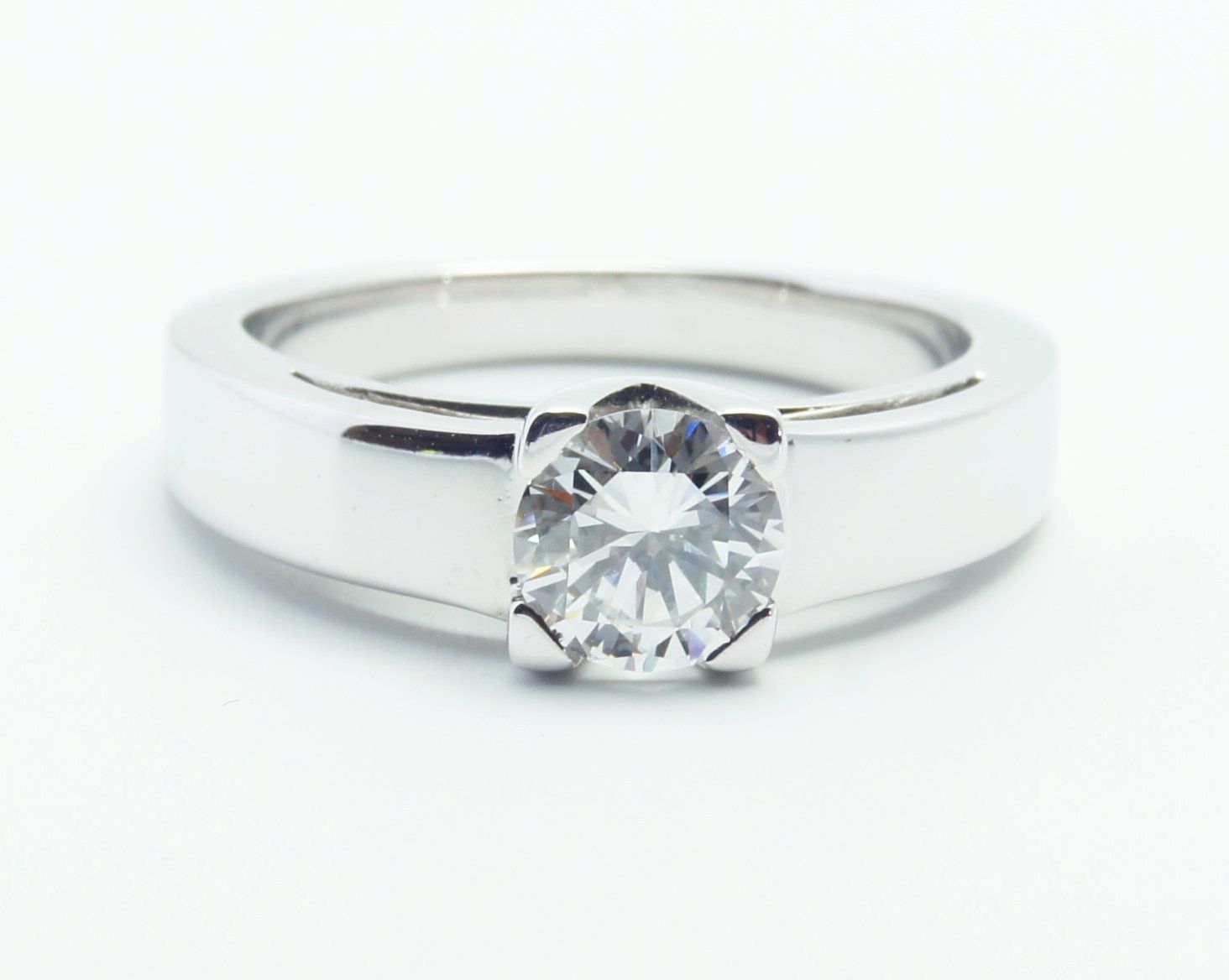 en or blanc 800/1000èmes , monture "sportive" avec un corps assez large, fait main. Diamant de 0,70 ct F VS2 certifié HRD .
