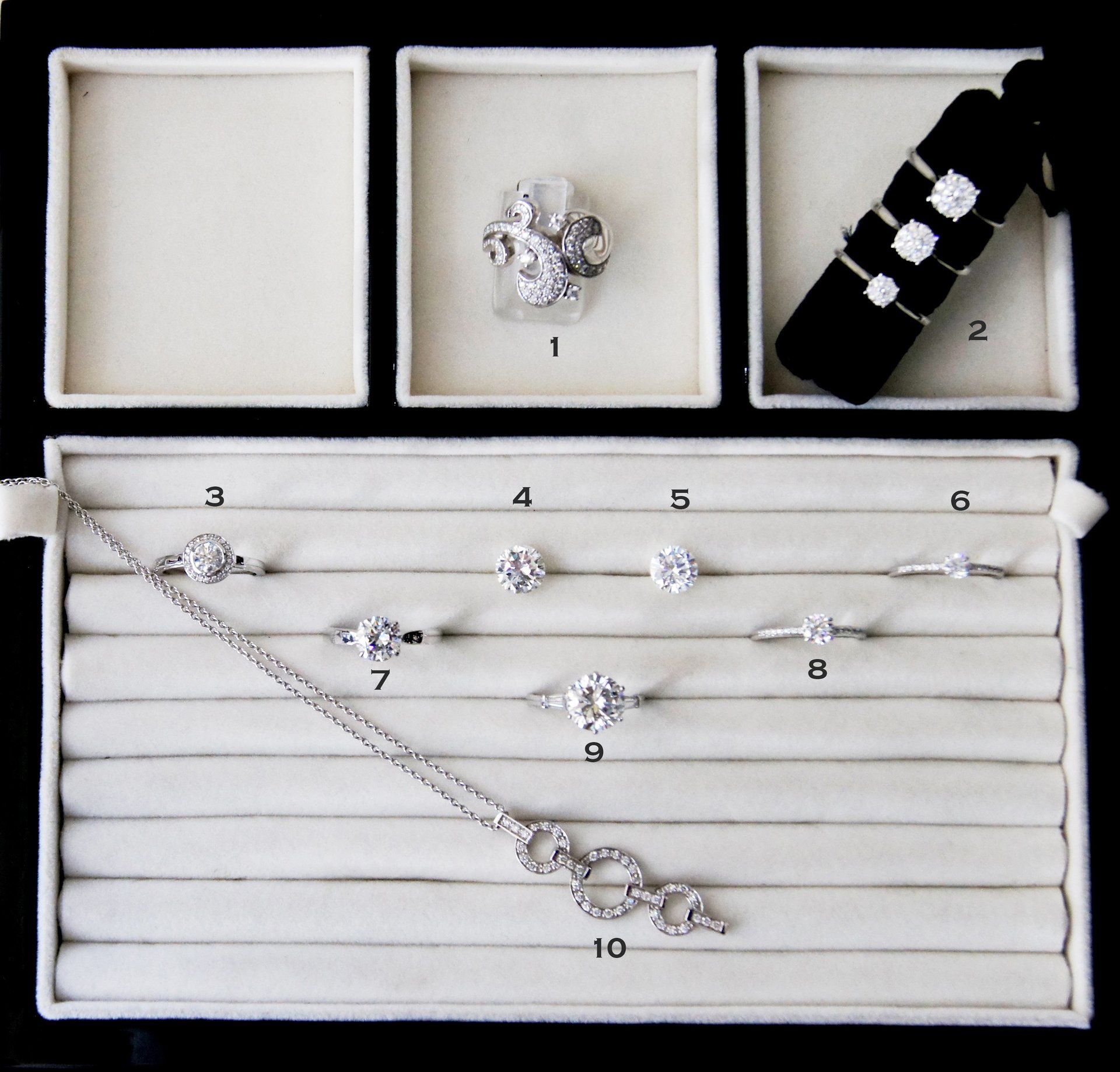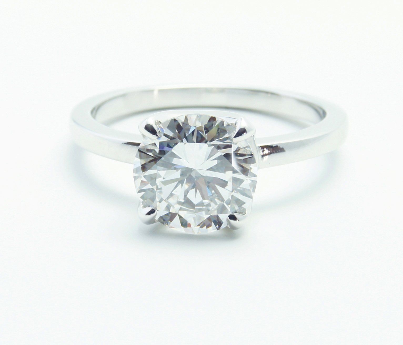 2) Exemple de bagues identiques en différentes grosseurs de diamants et qualités, montures fines en or blanc 18kt.