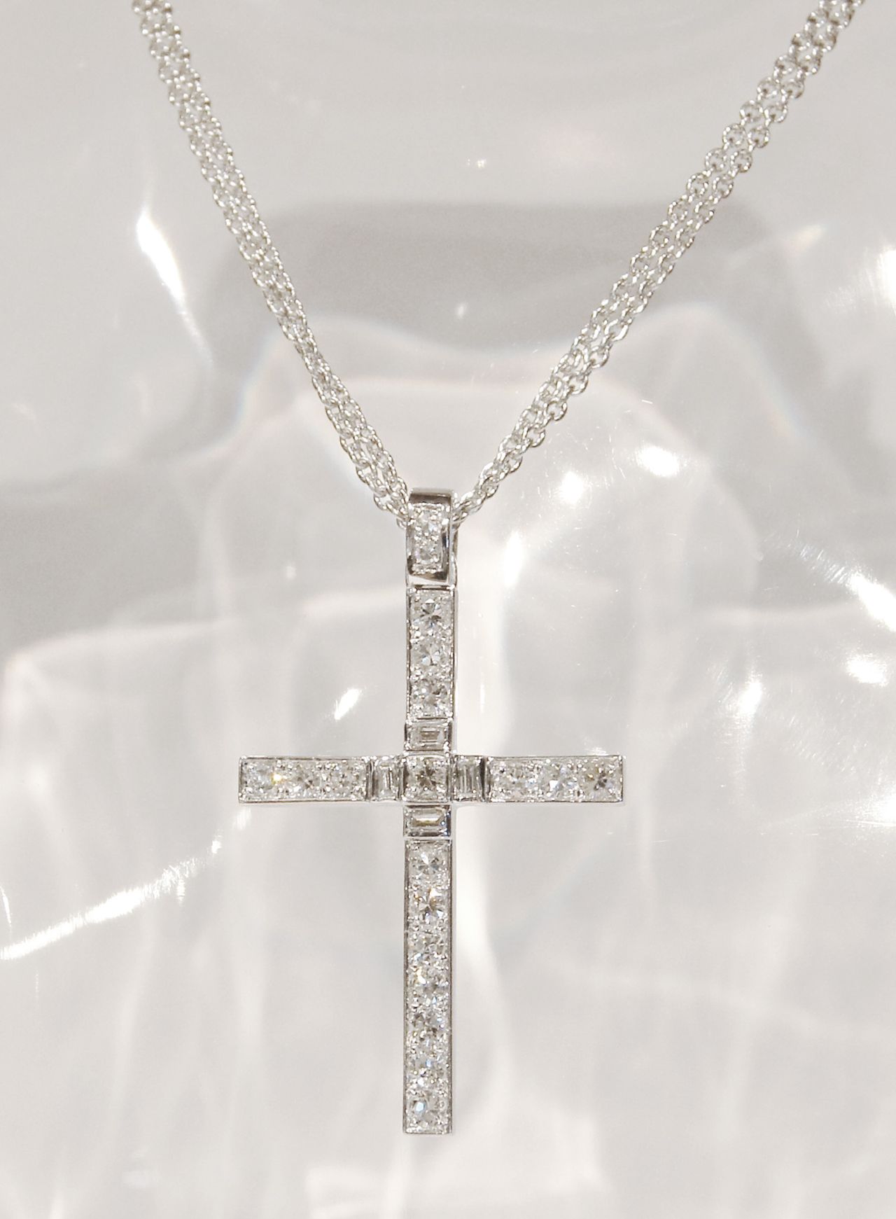 Nous avons réalisé cette grande croix en or blanc 18 kt d'environ 4/5 cm de haut sur 3 cm de large (environ 10 gr). Un diamant rond dans un "carré" surélevé en son épicentre, encadré de 4 diamants de taille baguette et dans le prolongement vers le haut comme le bas, 15 diamants ronds, et 3 diamants plus petits sertis sur la bélière.