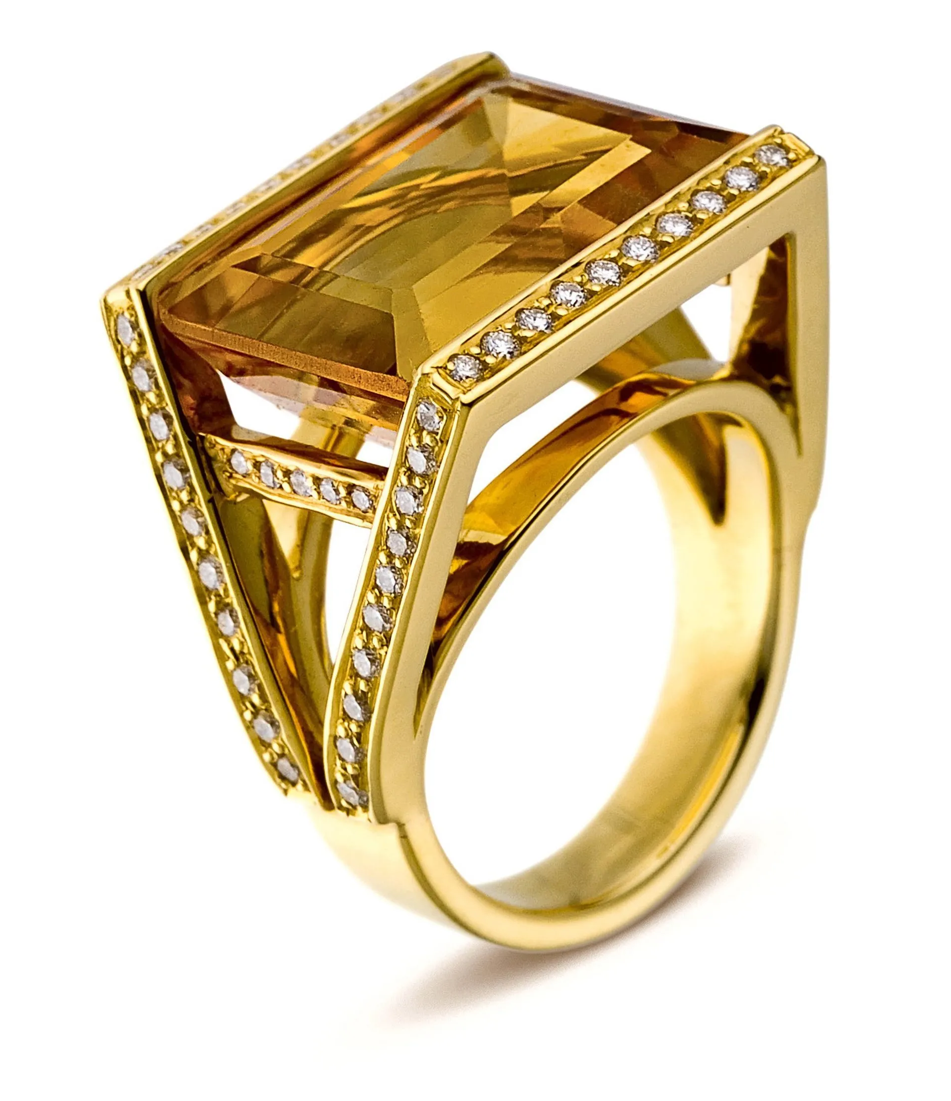 Citrine taille émeraude de 18 cts environ , Brillants TW-VS 0,70 ct, Or jaune 18kt- 15,30 gr environ. Fabrication sur commande, Prix sur devis.