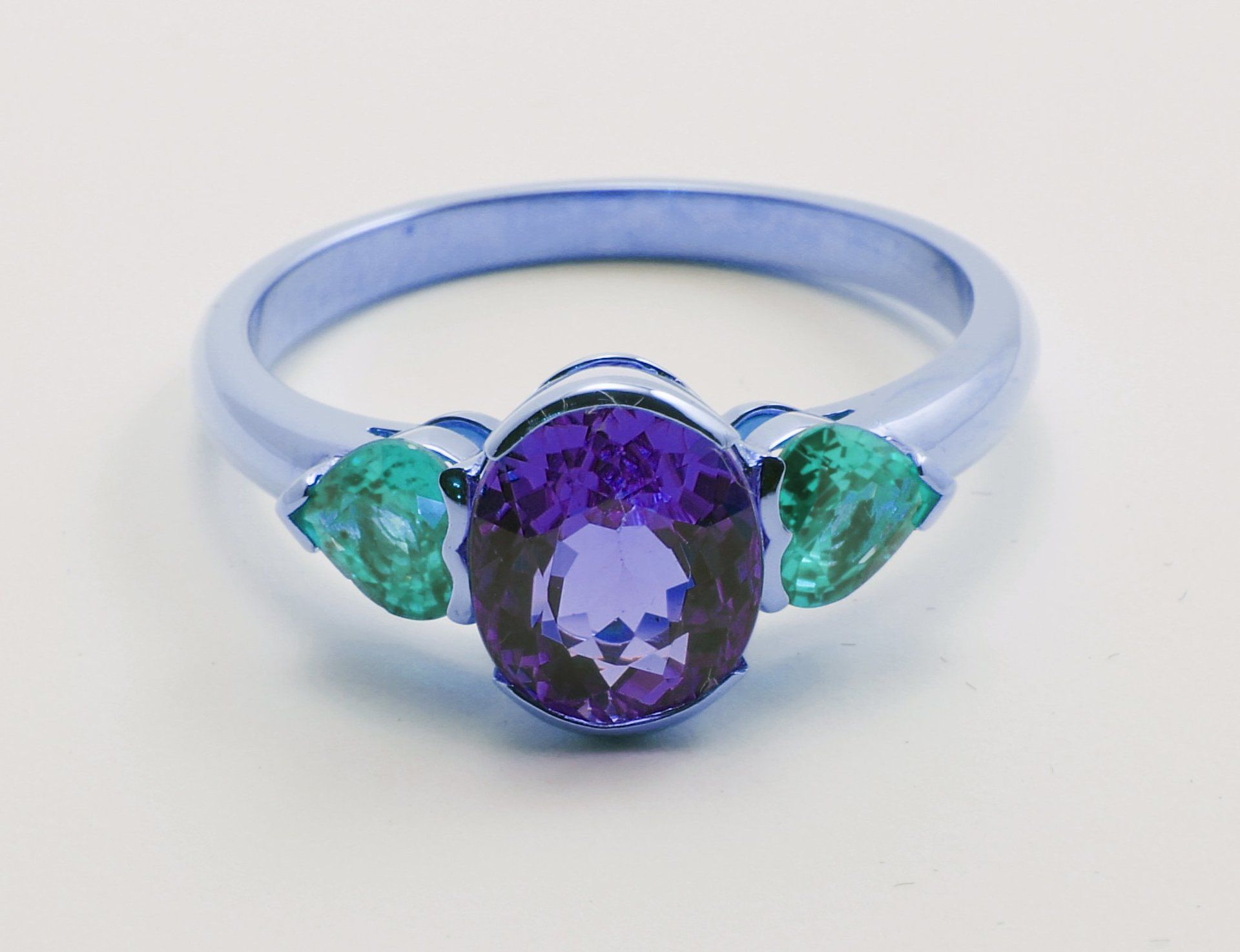 Saphir mauve ovale 2,50 ct et deux tourmalines paraïba de forme coeur 1,02ct.
