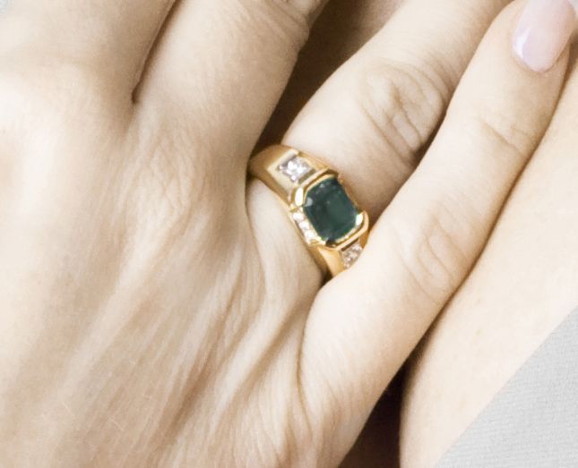 La bague visible au doigt du modèle est une émeraude de Colombie de 1,65ct, taille émeraude , montée sur une monture en serti demi-clos en or jaune 18kt, deux diamants princesses pour un total de 0,38ct, et pavage diamant latéral. Pièce unique. Prix 12900 € TTC, disponible