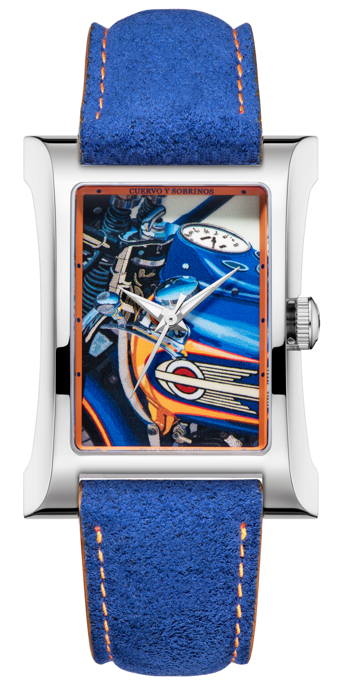 Le cadran de la montre Espléndidos Scott Jacobs a servi de toile horlogère à l'artiste américain pour exprimer sa créativité. Dans un premier temps, Scott a produit une œuvre originale en taille réelle. Par la suite, cette œuvre a été reproduite sous forme miniature à l'aide d'une technique spéciale d'impression laser 4 couleurs. Chaque teinte éclatante de la Knucklehead Bobber de 1939 est magnifiquement représentée sur le cadran distinctif de la montre.