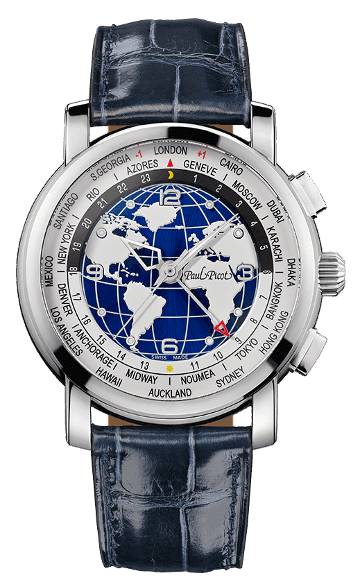Calibre base Lemania 8810 avec complication GMT, heure locale sur 24 heures avec indicateur jour nuit et world timer sur 12 heures.