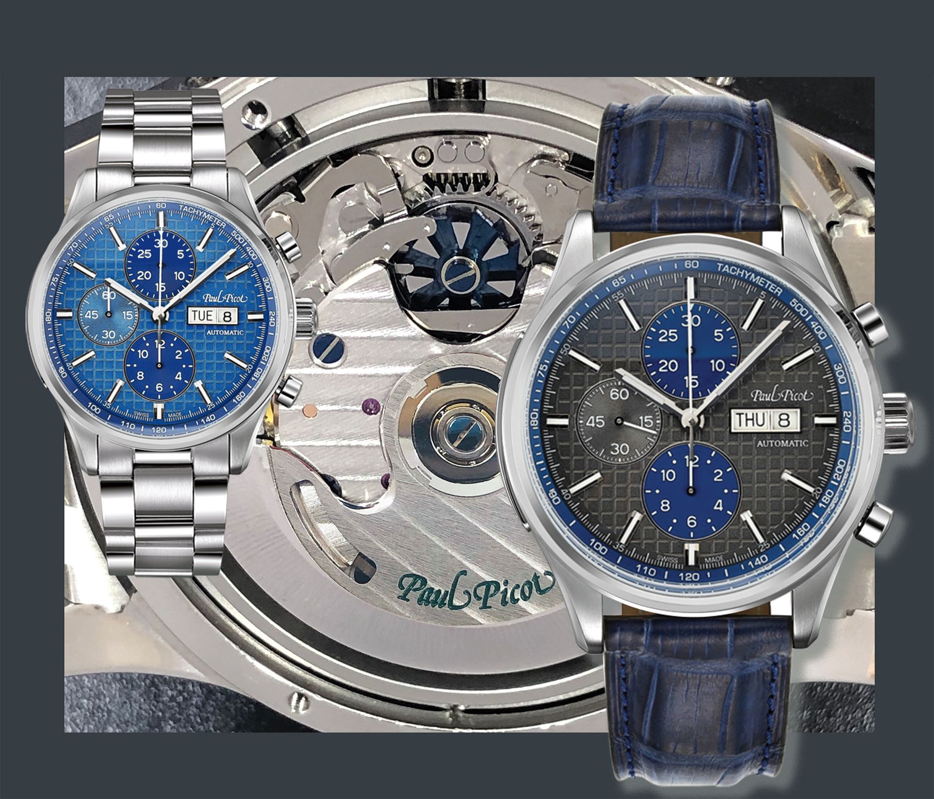 Ces premiers modèles sont proposés en boutique dans les combinaisons Bleu/Bleu et Gris/Bleu... mais les autres cadrans Meadow Green et Dark Chocolate aussi proposés sur commande. La base du cadran est en outre personnalisée par un guillochage en grille rappelant celui du légendaire Paul Picot C-Type Plongeur.