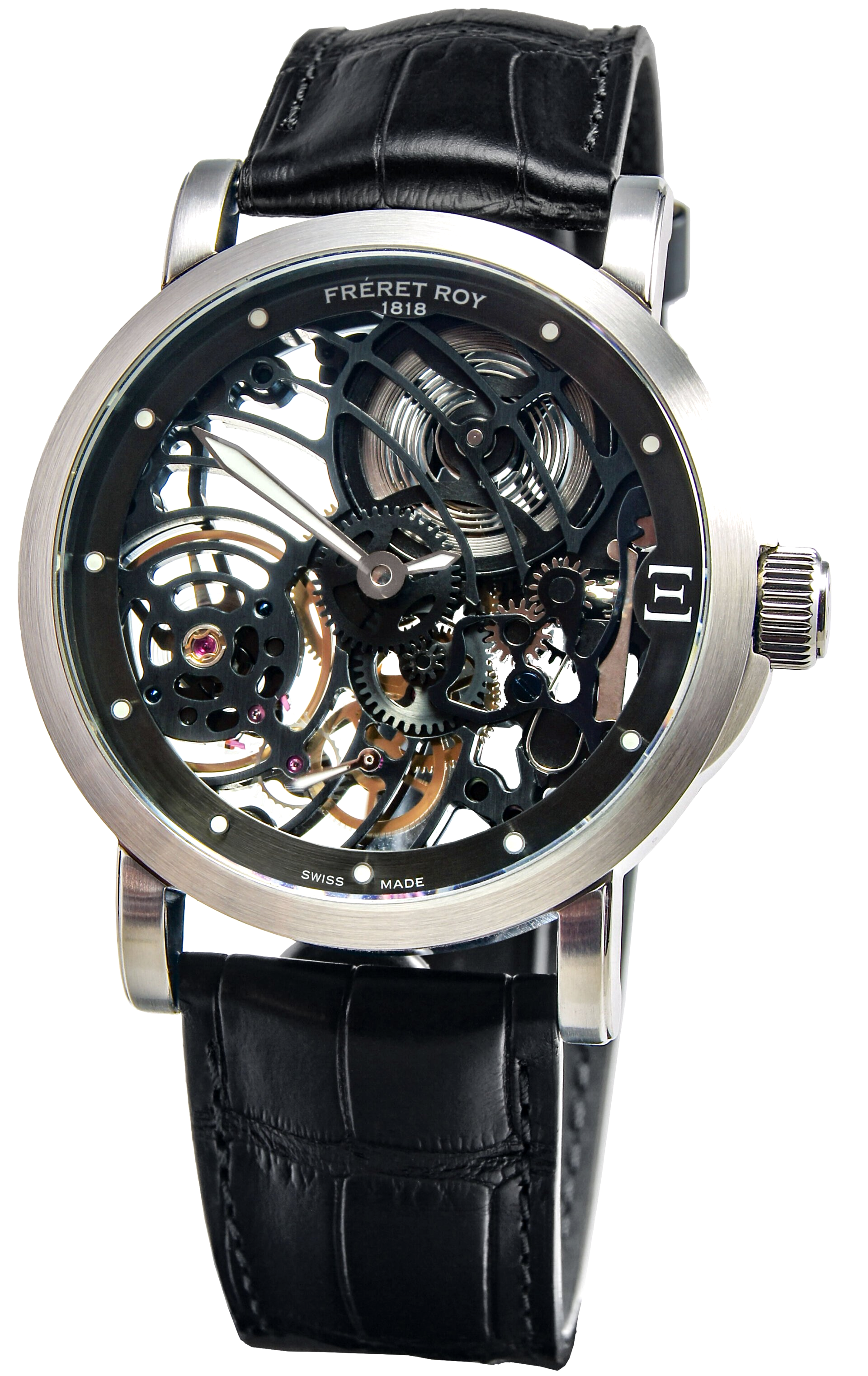 Désormais déclinée en boîtier acier-noir, la montre Fréret Roy 1818 Coeur Ouvert® Petite Minute® Noir casse les codes en affichant une grande heure et la désormais fameuse Petite Minute®, cette fois présentée dans le nouveau calibre squelette propre à la marque. Il s'agit de la première collection de montres mécaniques du marché horloger avec une grande aiguille des heures et une petite minute centrale en version squelette intégral !