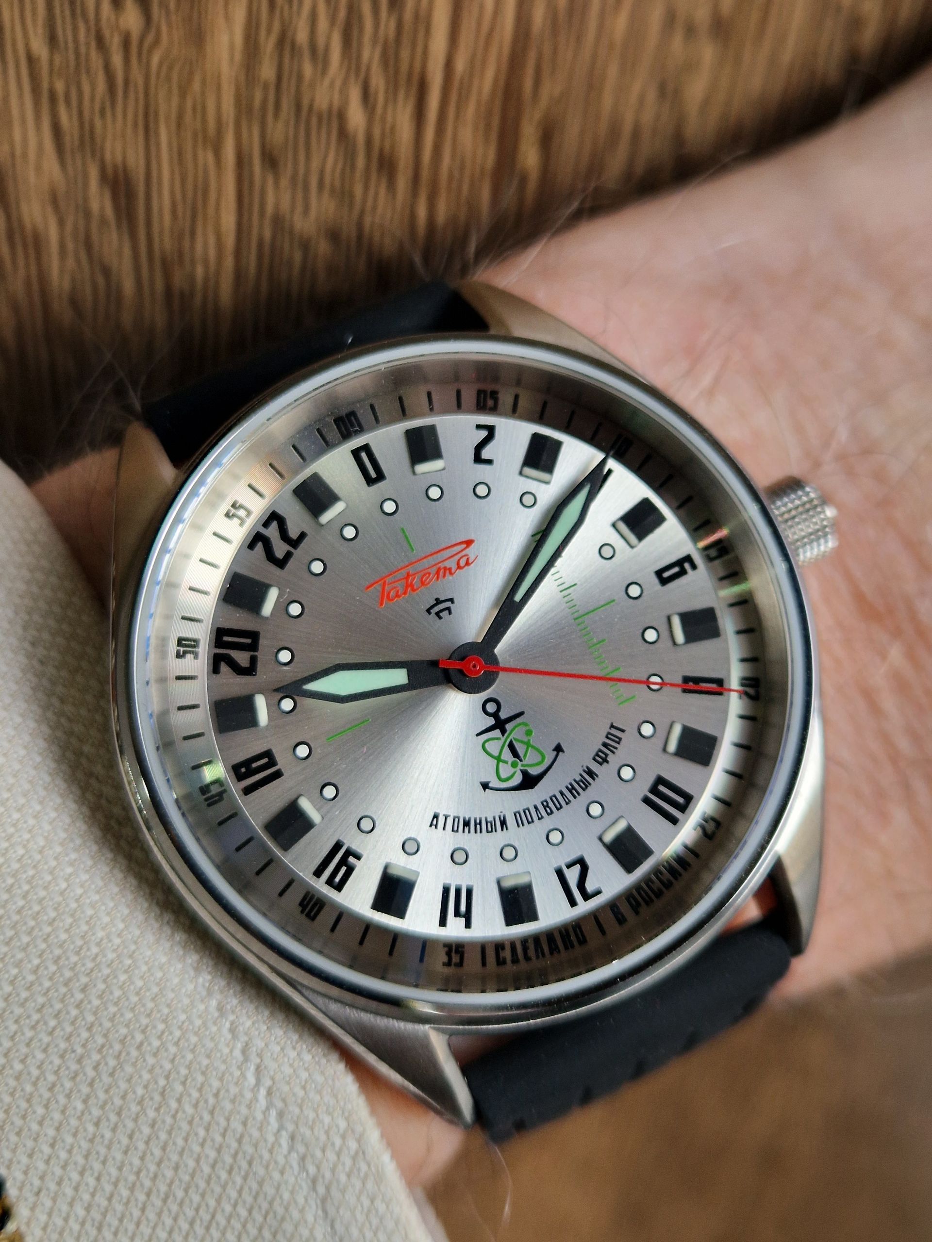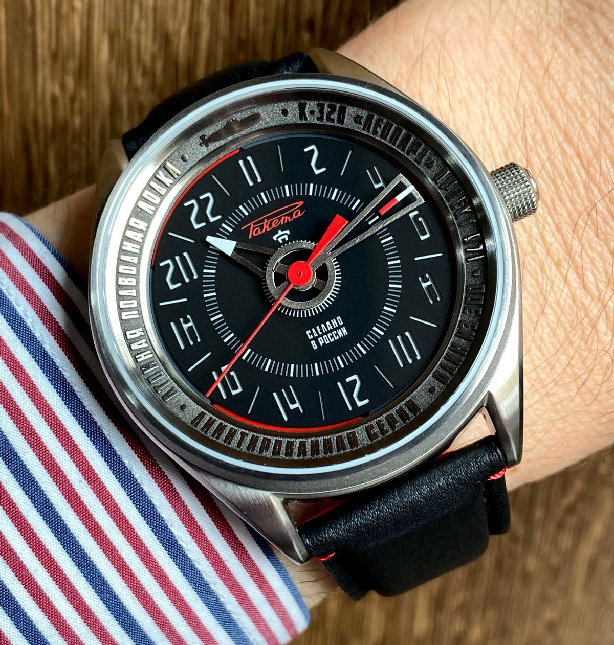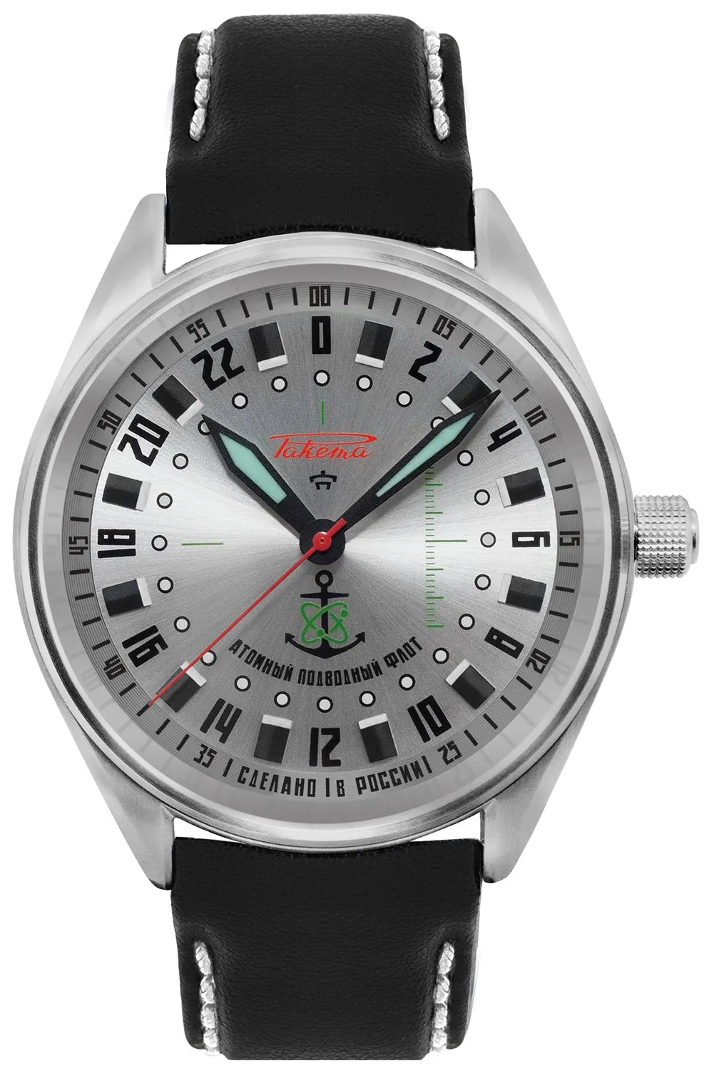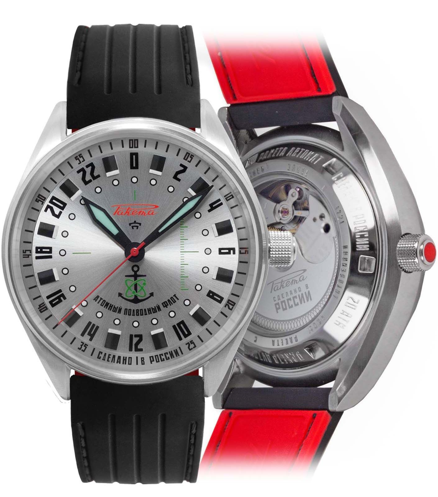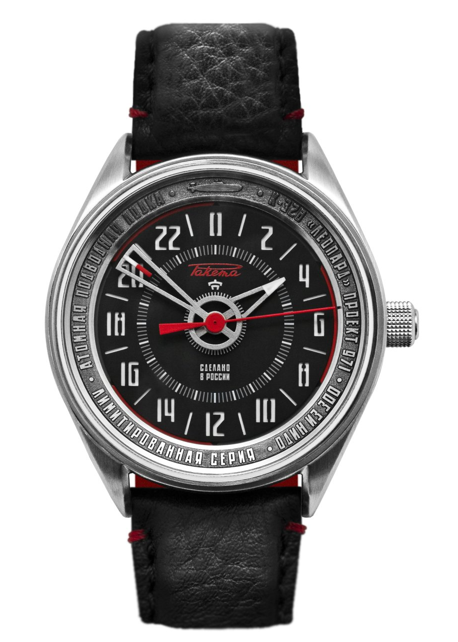 Pour réaliser cette montre 24 heures de sous-mariniers russes, Raketa a utilisé du métal provenant du sous-marin “Léopard” (de classe Akula). Le métal a été officiellement donné à Raketa par le chantier naval actuellement en charge de la modernisation du “Léopard”. Le métal provient de la coque extérieure du Léopard.
