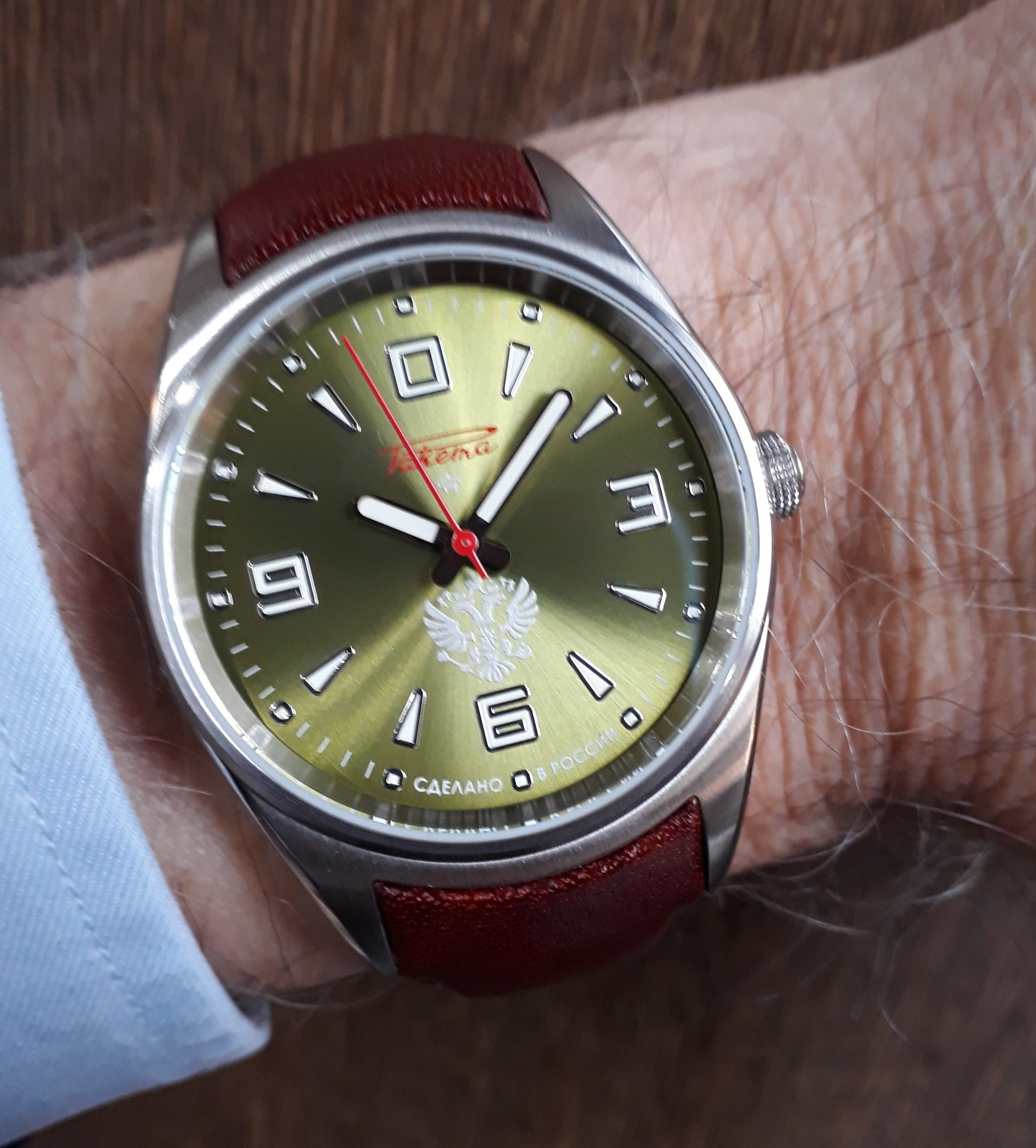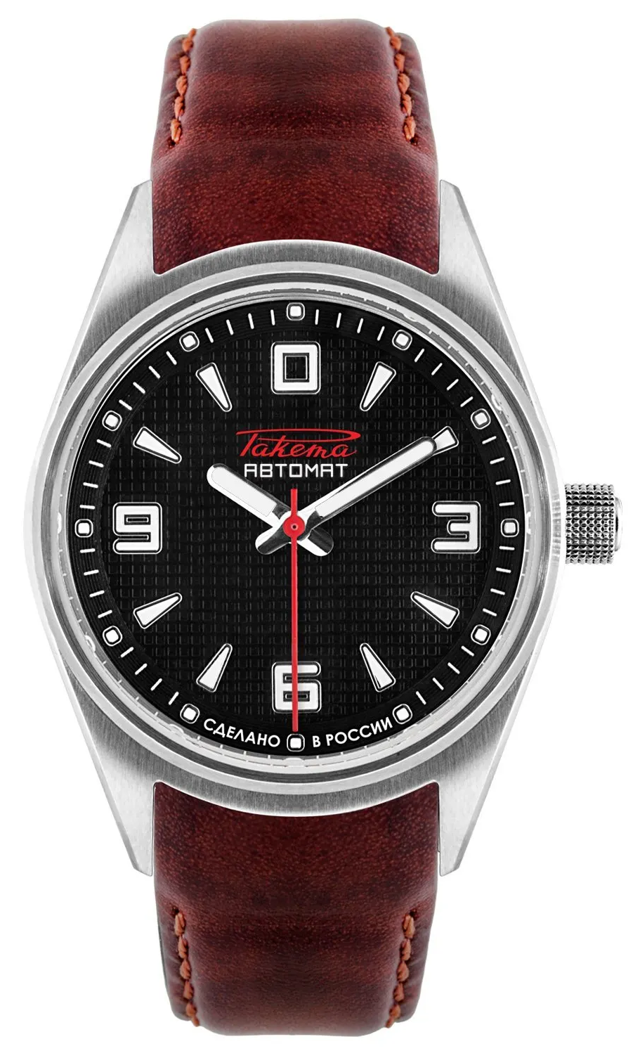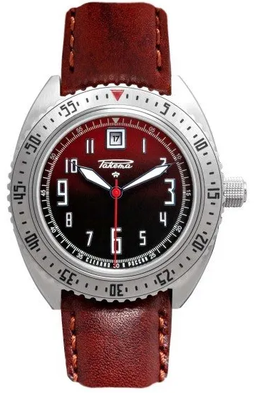 Cadran bordeaux soleillé chifffres et aiguilles luminescents, boîtier acier 43mm, verre saphir, fond transparent, calibre Avtomat 2616 date à 12H, sur bracelet cuir marron/rouge. Prix : épuisé !